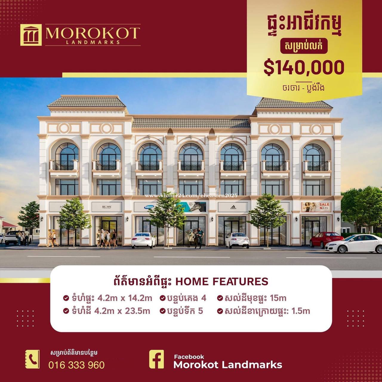 🏠 ផ្ទះអាជីវកម្ម #ដាក់លក់បន្ទាន់ St.42 💸 តម្លៃ 140,000$ (ចរចា) - ទីតាំងស្ថិតនៅ ៖ បុរី ផ្លូវ 42 ខាងលិចផ្លូវកប់ស្រូវ នៅលើផ្លូវធំ ខាងកើតរង្វង់មូលក្រមងុយផ្លូវ42 ត្រឹមតែ100ម៉ែត្រ។ * លក្ខណៈពិសេស ផ្ទះស្អាតសម្រាប់ស្នាក់នៅ បើកហាង ការិយាល័យ និងអាជីវកម្មនៅជាប់ផ្លូវធំ ជាពិសេសនៅជិតសាលារៀននិង ផ្សារទំនើបជាច្រើន 👉 កាត់ប្លង់រឹងជូន 📣 ព័ត៌មានបន្ថែម : 📞 012587xxxClick To Call (Telegram) 📞 016333xxxClick To Call (Telegram) #Morokot_Landmarks #houseforsale #houseforrent #landforsale #landforrent #warehouseforsale #warehouseforrent