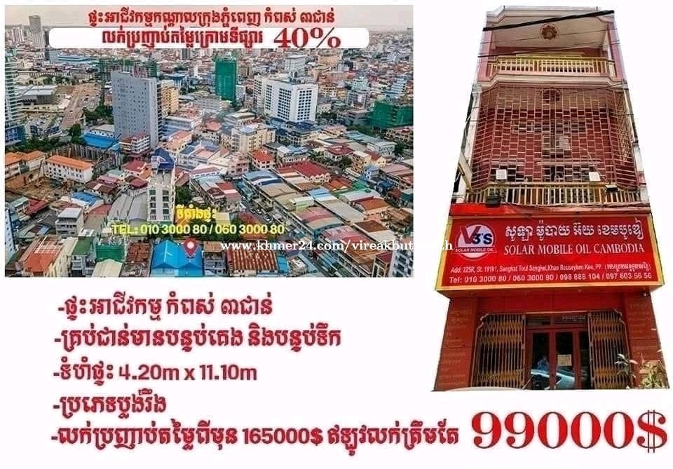 🏡 ផ្ទះអាជីវកម្ម កណ្តាលក្រុងភ្នំពេញកំពស់ 3ជាន់ (លក់ប្រញាប់ តម្លៃក្រោមទីផ្សារ 40%) -គ្រប់ជាន់មានបន្ទប់គេង និងបន្ទប់ទឹក -ទំហំផ្ទះ 4.20m x 11.10m -ប្រភេទប្លង់រឹងក្រសួងដែនដី 🏡 លក់ប្រញាប់តម្លៃពីមុន 150000 ឥឡូវលក់ត្រឹមតែ 99000$ ប៉ុណ្ណោះ! 🏡 ផ្តល់ការកាត់ឈ្មោះ និងបង់ពន្ធជូន 100% ♻ Link Telegram: https://t.me/vireakbuth010 https://t.me/ahpich098 https://t.me/rathana095 📱ព័ត៍មានបន្ថែម៖ -010300xxxClick To Call -060300xxxClick To Call -098888xxxClick To Call -0976035xxxClick To Call 🏡ទីតាំងផ្ទះ : ភូមិទួលសង្កែ សង្កាត់ទួលសង្កែ១ ខណ្ឌឬស្សី កែវ រាជធានីភ្នំពេញ ។ 📍 Location: Tuol Sangke https://maps.app.goo.gl/gChVtwyQG63EsvQp8