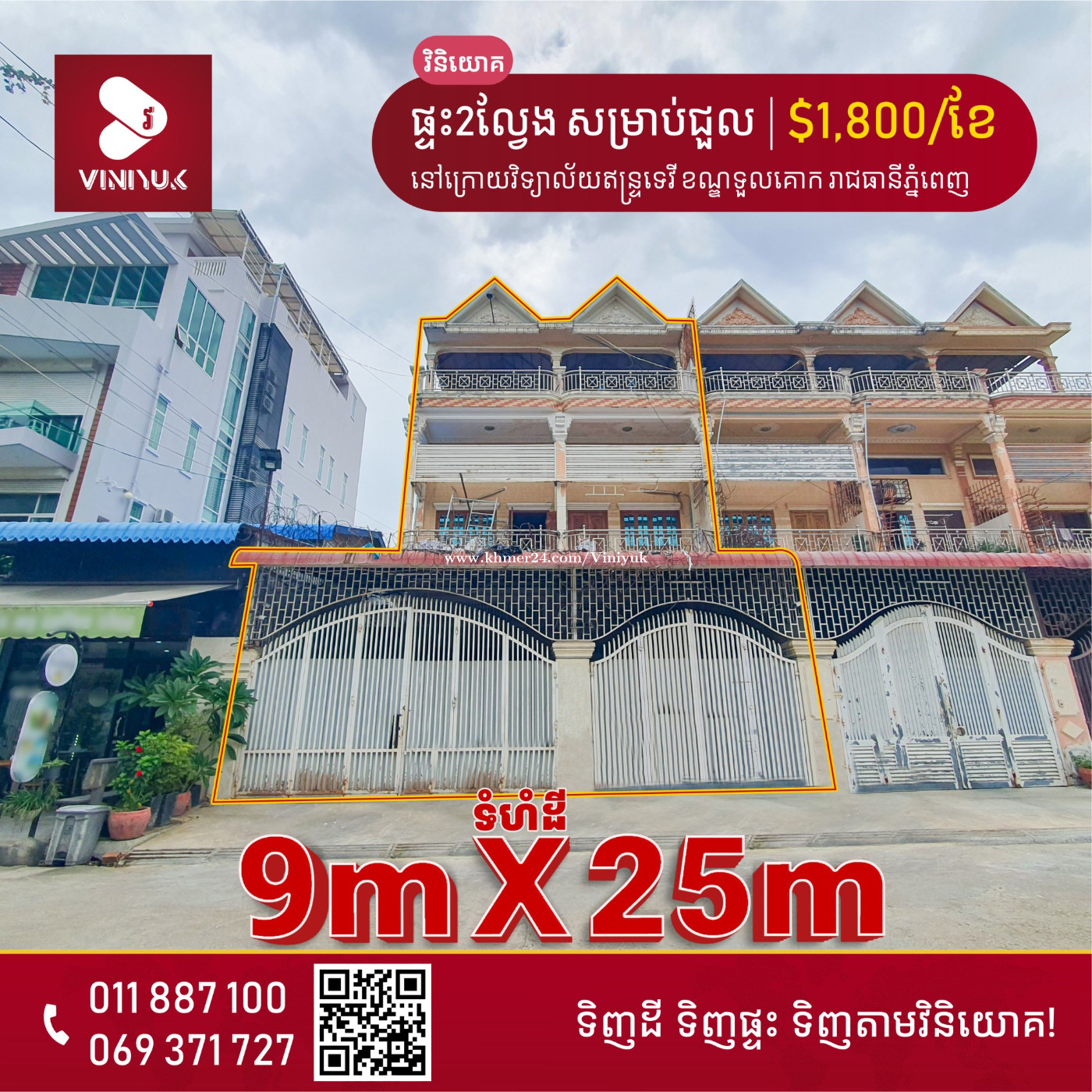 🏡ផ្ទះ២ល្វែង សម្រាប់ជួល!! 📍ទីតាំង៖ នៅក្រោយវិទ្យាល័យឥន្រ្ទទេវី ខណ្ឌទួលគោក រាជធានីភ្នំពេញ - តម្លៃជួល : $1,800/ខែ ចរចា - ទំហំផ្ទះ : 8m x 16m - ទំហំដី : 9m x 25m - មានបន្ទប់ 9 , បន្ទប់ទឹក 8 - មាន 3ជាន់ - លេខអាជ្ញាប័ណ្ណ : E-22-404 📲សូមធ្វើការទំនាក់ទំនង ៖ 011887xxxClick To Call | 069371xxxClick To Call