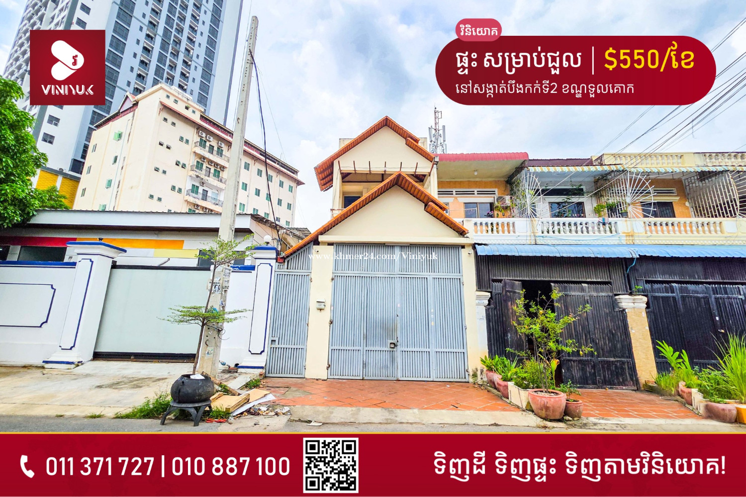 🏡ផ្ទះ សម្រាប់ជួល!! 📍ទីតាំង ៖ នៅសង្កាត់បឹងកក់ទី2 ខណ្ឌទួលគោក រាជធានីភ្នំពេញ - តម្លៃ : $550/ខែ ចរចា - ទំហំដី : 5m x 25m - ទំហំផ្ទះ ៖ 4m x 20m - មានបន្ទប់ 4 , បន្ទប់ទឹក 5 - ផ្ទះបែរទៅទិសកើត - លេខអាជ្ញាប័ណ្ណ : E-22-404
