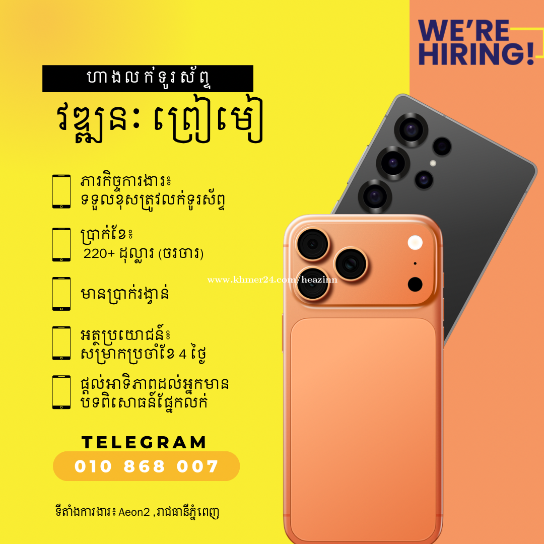 🔍លក្ខខណ្ឌជ្រើសរើស៖ - ឆ្ភេទស្រី - រូបសម្បត្តិសមរម្យ - ពូកែទំនាក់ទំនង និង មានភាពរួសរាយរាក់ទាក់ - មានភាពអត់ធ្មត់ និង ឧស្សាហ៍ព្យាយាមក្នុងការងារ។ 1ថ្ងៃក្នុង 1សប្ដាហ៍ Telegram : 010868xxxClick To Call 📍ទីតាំង៖ Aeon2