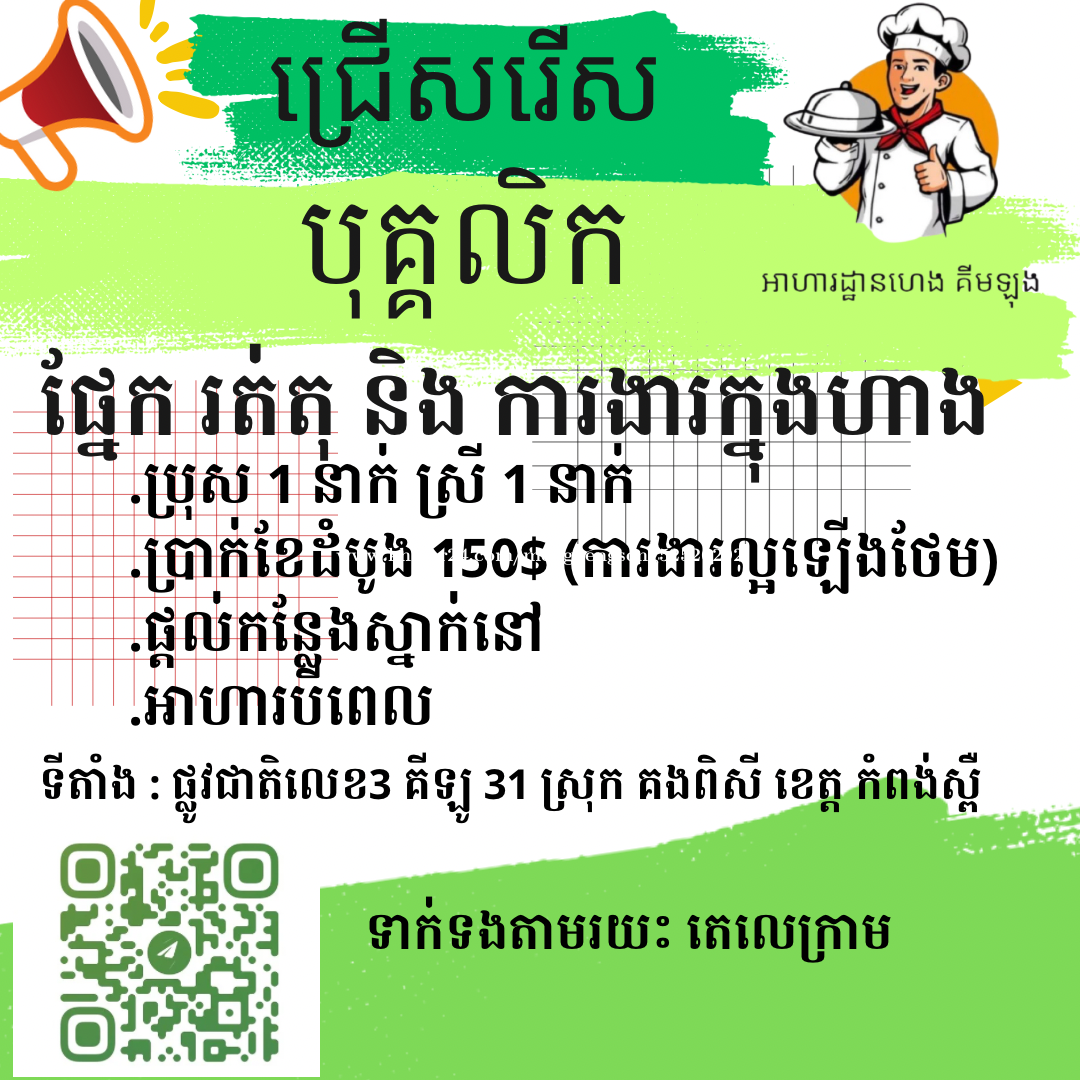 ត្រូវការបុគ្គលិកស្រី ២ នាក់ (17-25) មានកន្លែងស្នាក់នៅ បាយបីពេល ប្រាក់ខែឡើងតាមការងារល្អ ទំនាក់ទំនង តាម រយះ តេលេក្រាម ខាង លើ