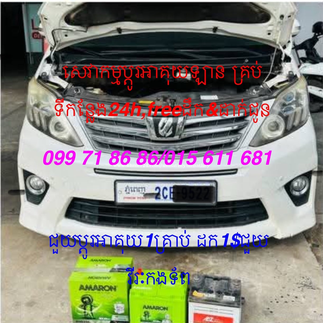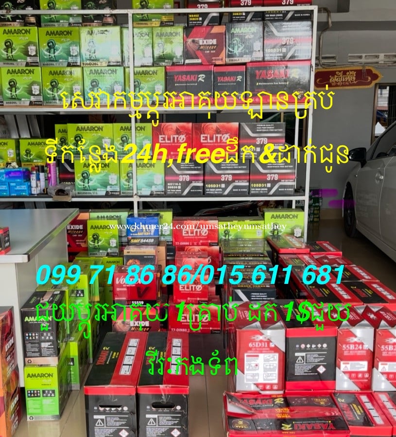 យើងខ្ញុំមានសេវាកម្មប្តូរអាគុយឡានគ្រប់ប្រភេទនិងគ្រប់ទីកន្លែង24ម៉ោង ក្នុងតំលៃសមរម្យ រហ័សទាន់ចិត្ត ធានាគុណភាពល្អ 099718xxxClick To Call/015611xxxClick To Call