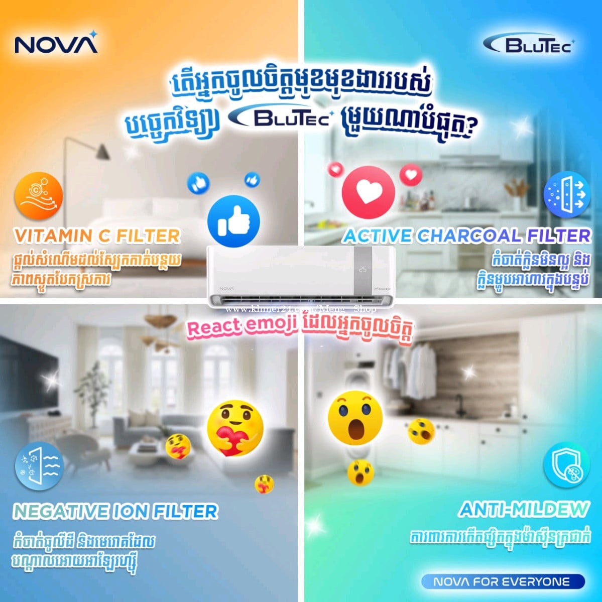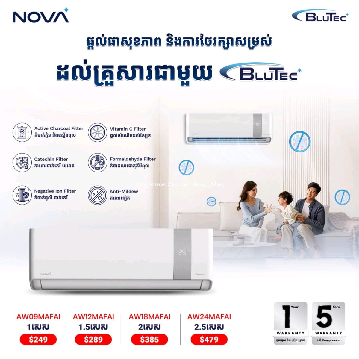 ម៉ាសុីនត្រជាក់NOVAដែរបានបំពាក់មកជាមួយបច្ចេកវិទ្យាINVERTERជួយសន្សំសំចៃភ្លេីងខ្ពស់រហូតទៅដល់40%🔥និងមានបច្ចេកវិទ្យា BLUTEC ដែរមានមុខងារពិសេស4: •Vitamin C Filter: ផ្ដល់សំណើមដល់ស្បែក និងធ្វើអោយបរិយាកាសបន្ទប់ស្រស់ស្រាយ •Active Charcoal Filter: កាត់បន្ថយក្លិនមិនល្អ, ផ្សែងពុល,និងក្លិនម្ហូបអាហារ •Negative Ion Filter: កំចាត់ធូលីដី និងមេរោគដែលបណ្ដាលអោយអាឡែរហ្ស៊ី និងបំបាត់សារធាតុគីមីពុលនានាដែលបញ្ចេញមកពីគ្រឿងសង្ហាររឹម •Anti-Mildew: ការពារការកកើតនៃផ្សិតនៅក្នុងផ្ទៃខាងក្នុងនៃម៉ាស៊ីនត្រជាក់ ❄️ម៉ាសុីនត្រជាក់NOVAមាន4ទំហំដូចជា: 1សេស តម្លៃ $249 1.5សេស តម្លៃ $289 2សេស តម្លៃ $385 2.5 សេស តម្លៃ $479 “បំពាក់បច្ចេកវិទ្យា Inverter សន្សំសំចៃភ្លើង”💡