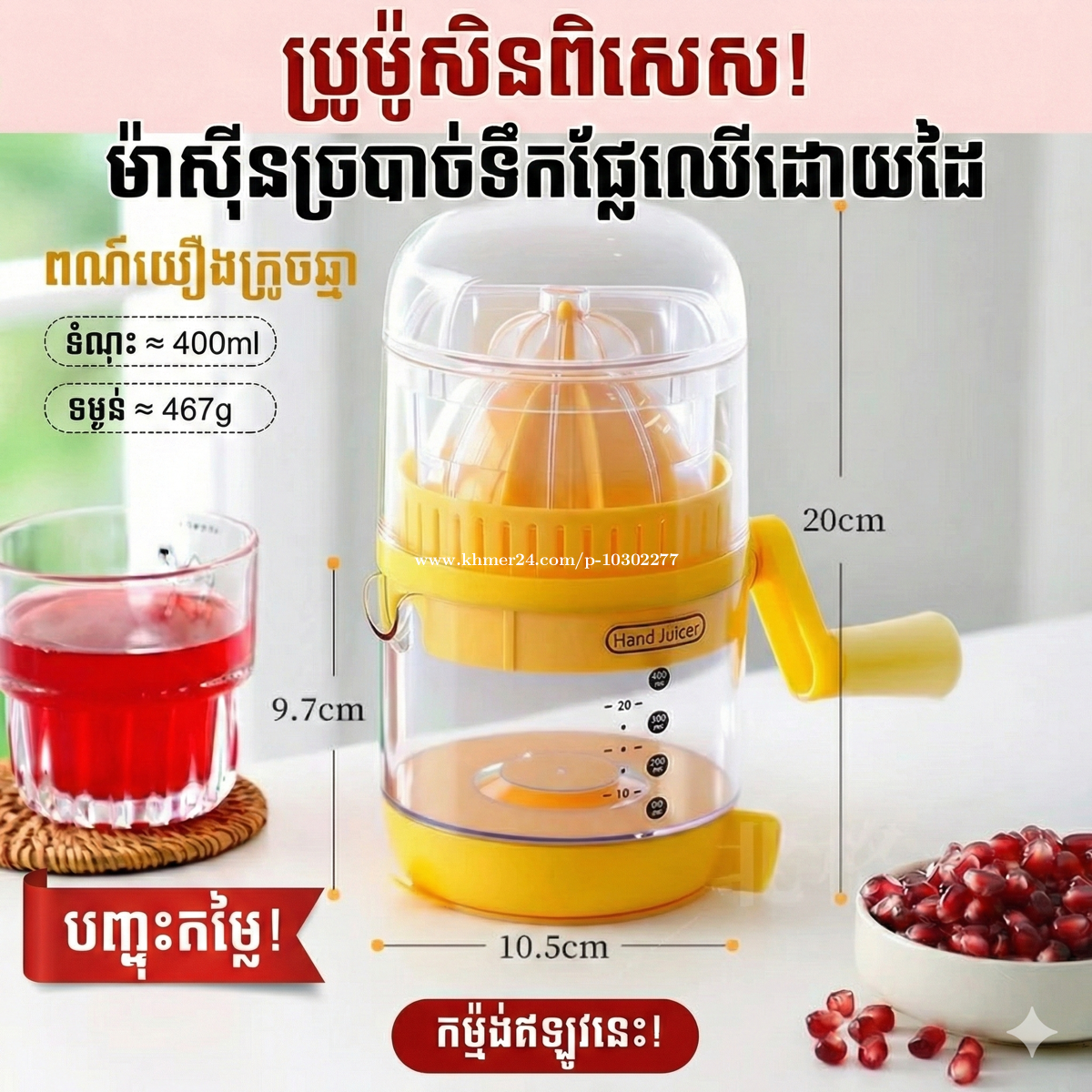 🍊 ម៉ាស៊ីនគិនទឹកផ្លែឈើដោយដៃ ងាយស្រួលបំផុត! 🍋 ចង់ញ៉ាំទឹកផ្លែឈើស្រស់ៗ មិនបាច់ប្រើភ្លើង មិនពិបាកលាងសម្អាតមែនទេ? មកសាកប្រើម៉ាស៊ីនគិនដៃនេះមើល៎! ✅ ចំណុះធំ: ដាក់បាន 400ml ✅ ងាយស្រួល: គ្រាន់តែដាក់ផ្លែឈើចូល រួចបង្វិលដៃកាន់ជាការស្រេច ✅ សារប្រយោជន៍: អាចគិនបានទាំងផ្លែឈើមានគ្រាប់ (ដូចជាទទឹម) និងផ្លែឈើទាំងសំបក (ដូចជាក្រូច)។ ✅ ពណ៌ស្អាតៗ: មានពណ៌ លឿង ក្រហម និងបៃតង។ 💰 តម្លៃត្រឹមតែ: ៣០,០០០ រៀល ប៉ុណ្ណោះ! 🚚 ពិសេស: ដឹកជញ្ជូនជូនដោយឥតគិតថ្លៃ (Free Delivery) 📍 ទីតាំង: ផ្សារតូច ☎️ ទំនាក់ទំនងកម្ម៉ង់: 010302xxxClick To Call ៣. របៀបប្រើប្រាស់ 1. រៀបចំផ្លែឈើ: លាងផ្លែឈើឱ្យស្អាត (ដូចជា ក្រូច ទទឹម ឬឪឡឹក)។ បើផ្លែធំ ត្រូវកាត់ជាដុំតូចល្មមនឹងកែវ។ 2. ដាក់ចូលម៉ាស៊ីន: បើកគម្របខាងលើ ហើយដាក់ផ្លែឈើចូលក្នុងប្រឡោះគិន។ 3. បិទគម្រប: ដាក់គម្របសង្កត់ពីលើផ្លែឈើ។ 4. បង្វិល: ចាប់កាន់ដៃបង្វិល (Hand Crank) ឱ្យវិលជាជារង្វង់។ ម៉ាស៊ីននឹងកិនយកទឹកធ្លាក់ចូលកែវខាងក្រោម ហើយបំបែកគ្រាប់ឬកាកនៅខាងលើ។ 5. ទទួលទាន: ចាក់ទឹកផ្លែឈើចេញពីកែវ ញ៉ាំបានភ្លាមៗ!