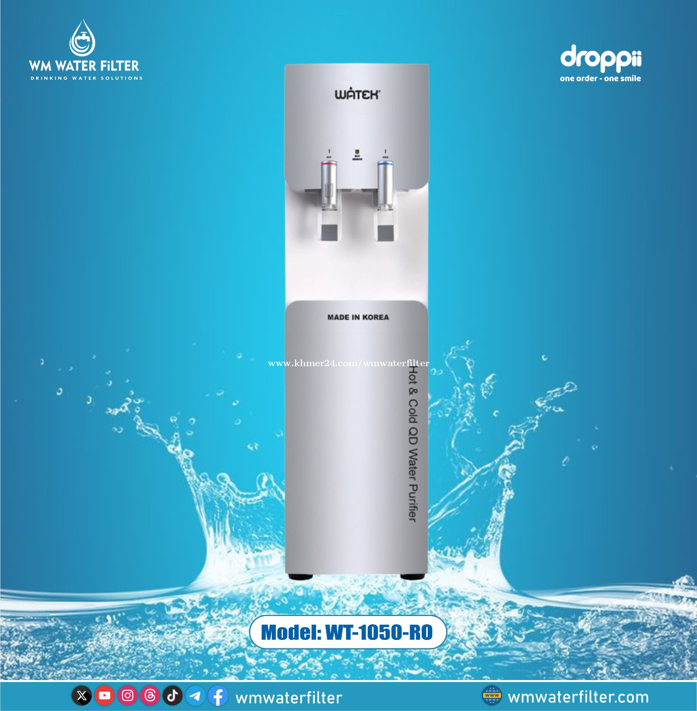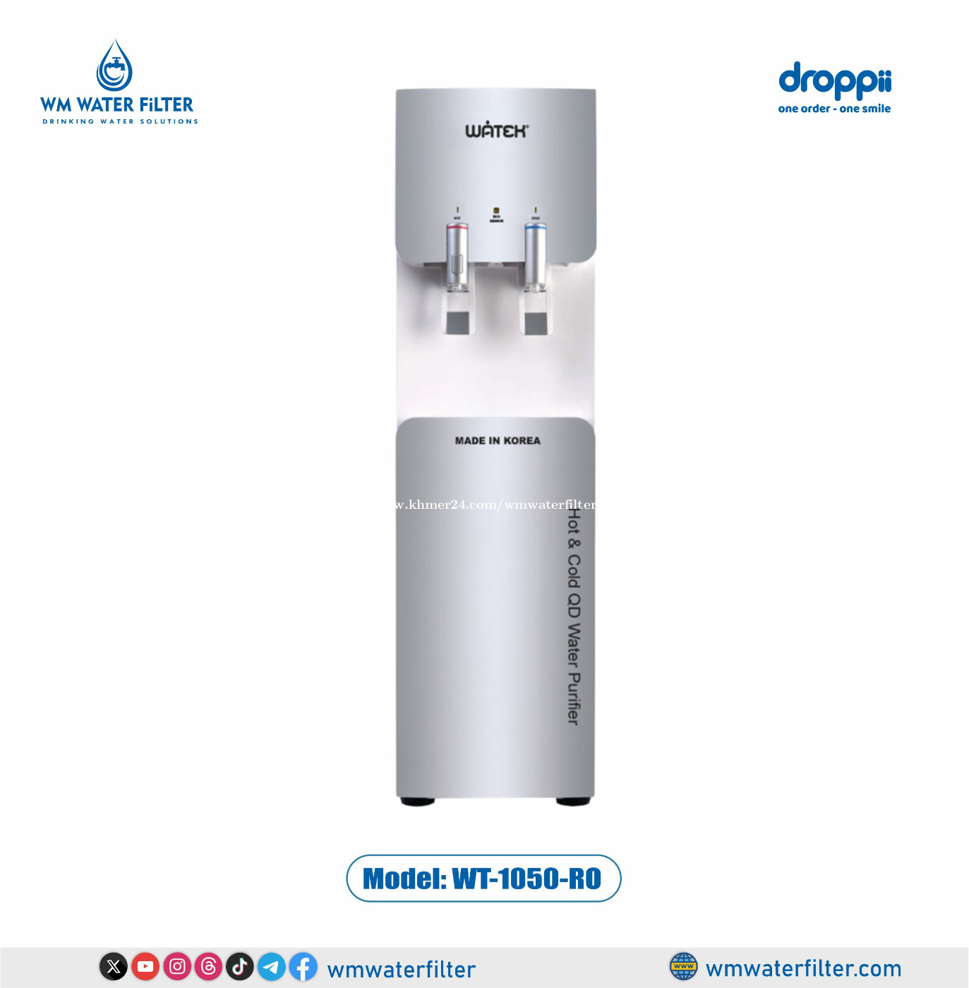 ម៉ាស៊ីនចម្រោះទឹកក្ដៅ និងត្រជាក់ Watek RO ម៉ូឌែល WT-1050-RO គុណសម្បិត្ត – រួមបញ្ចូលនូវបច្ចេកវិទ្យាកង់ទិច (Quantum) មានសមត្ថភាពសម្លាប់មេរោគ និងបាក់តេរីដ៏មានប្រសិទ្ធភាពបំផុតបន្ទាប់ពីប៉ះត្រូវត្រឹមតែ 1/10 វិនាទីប៉ុណ្ណោះ។ – រួមបញ្ចូលនូវបណ្តូលអ៊ីដ្រូសែនអាល់កាឡាំង និងបន្ថែមសារធាតុរ៉ែមានប្រយោជន៍ដល់រាងកាយ។ – បំពាក់បច្ចេកវិទ្យា ECO-WATEK ដែលមានភ្នែកវេទមន្ត Eco sensor បិទភ្លើងដោយស្វ័យប្រវត្តិនៅពេលយប់ ដើម្បីជួយសន្សំសំចៃអគ្គិសនី។ – បំពាក់បច្ចេកវិទ្យា EXTRA-WATEK បង្កើនទឹកបម្រុងទុក ដើម្បីកាត់បន្ថយម៉ាស៊ីនដំណើរការឡើងវិញច្រើនដង។ – ទឹកក្តៅ 80-90°C និងត្រជាក់ 4-8°C។ – ប្រភពទឹកដែលអាចភ្ជាប់បាន៖ ទឹកម៉ាស៊ីន ទឹកភ្លៀង ទឹកអណ្តូង ។ល។ – ប្រើ Compressor LG រឹងមាំ ជាប់បានយូរ ល្បឿនកំដៅ/ត្រជាក់លឿន។ – នាំចូលទំាងមូលពីប្រទេសកូរ៉។ រសជាតិទឹកឆ្ងាញ់បែបធម្មជាតិ៖ – កម្ចាត់ជាតិពុល ភក់ ច្រែះ ពណ៌ និងក្លិនមិនល្អក្នុងប្រភពទឹក។ – ប្រើប្រាស់នូវបច្ចេកវិទ្យាចម្រោះដោយភ្នាស RO ដើម្បីកម្ចាត់ចោលជាតិពុល មេរោគ និងបាក់តេរី។ល។ – បង្កើតបានទឹកបរិសុទ្ធ សម្បូរណ៍ជាតិរ៉ែ អាល់កាឡាំង និងអ៊ីដ្រូសែន។ ប្រភពដើមច្បាស់លាស់៖ – បណ្តូលចម្រោះមានអក្សរផុស Made in Korea ដើម្បីជៀសវាងផលិតផលក្លែងក្លាយ។ – បណ្តូលតម្រងមានលេខកូដអន្តរជាតិដើម្បីតាមដានប្រភពដើមនៃផលិតផលពីក្រុមហ៊ុនផលិតនៅប្រទេសកូរ៉េ។ ការរចនាដ៏ប្រណិត និងថ្លៃថ្នូរ សាកសមសម្រាប់កន្លែងជាច្រើន៖ – សាកសមសម្រាប់ប្រើប្រាស់ក្នុងផ្ទះ បន្ទប់ទទួលភ្ញៀវ បន្ទប់គេង ផ្ទះបាយ។ – សមត្ថភាពចម្រោះខ្លាំង៖ សាកសមសម្រាប់ការិយាល័យ មន្ទីរពេទ្យ សាលារៀន ។ល។ – រចនាបង្រួមតូច សាកសមសម្រាប់ដំឡើងក្នុងទីធ្លាតូចចង្អៀត៖ ហាងកាហ្វេ ហាងអាហារសម្រន់ អាហារដ្ឋាន ។ល។ – ទឹកក្តៅរហូតដល់ 80-90°C និងត្រជាក់ 4-8°C។ រចនាសម្ព័ន្ធ បណ្តូលទី 1៖ បណ្តូល SENDIMENT ផលិតទាំងសំណុំពីប្រទេសកូរ៉េ – ចម្រោះនូវច្រែះ កម្ទេចកម្ទីរ ភាពកខ្វក់ដែលមាននៅក្នុងទឹក។ – កម្ចាត់ចោលនូវកករដី ក្លរីនដែលនៅសេសសល់ក្នុងទឹក។ – កាត់បន្ថយបាក់តេរី និងអតិសុខុមប្រាណមិនអោយបន្តចូលទៅក្នុងទឹក។ – អាយុកាលប្រើប្រាស់៖ 12 ខែ បណ្តូលទី 2៖ បណ្តូល PRE – CARBON ផលិតទាំងសំណុំពីប្រទេសកូរ៉េ – កម្ចាត់ចោលនូវសារធាតុកខ្វក់ និងកម្ទេចកម្ទីរធំៗ ដែលមានសមត្ថភាពស្រូបយកទឹកបានល្អប្រសើរ ដើម្បីបង្កើតភាពថ្លានៃទឹក។ – កម្ចាត់សារធាតុសរីរាង្គរំលាយ សារធាតុពុល ដូចជាថ្នាំសម្លាប់សត្វល្អិត សារធាតុលាងសម្អាត និងសារធាតុរំលាយផ្សេងៗ។ – មានប្រសិទ្ធភាពក្នុងការបំបាត់សារធាតុវិទ្យុសកម្ម អាសេនិច និងអាម៉ូញ៉ូម។ – ស្រូបយកជាតិរំអិល បំបាត់ក្លិនមិនល្អ រក្សាទឹកមានរសជាតិឆ្ងាញ់។ – អាយុកាលប្រើប្រាស់៖ 12 ខែ បណ្តូលទី 3៖ បណ្តូល RO ផលិតទាំងមូលពី