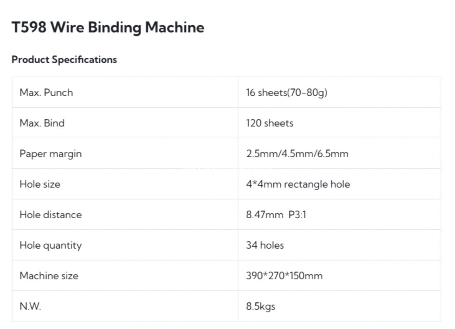 ម៉ាស៊ីនចោះកង T598 លក្ខណៈបច្ចេកទេសផលិតផល អតិបរមា។ ដាល់ 16 សន្លឹក (70-80 ក្រាម) អតិបរមា ចង ១២០ សន្លឹក រឹមក្រដាស 2.5mm / 4.5mm / 6.5mm ទំហំរន្ធ រន្ធចតុកោណកែង 4 * 4 មម។ ចម្ងាយរន្ធ 8.47mm P3:1 បរិមាណរន្ធ ៣៤ រន្ធ ទំហំម៉ាស៊ីន 390 * 270 * 150 មម N.W. ៨.៥ គីឡូក្រាម