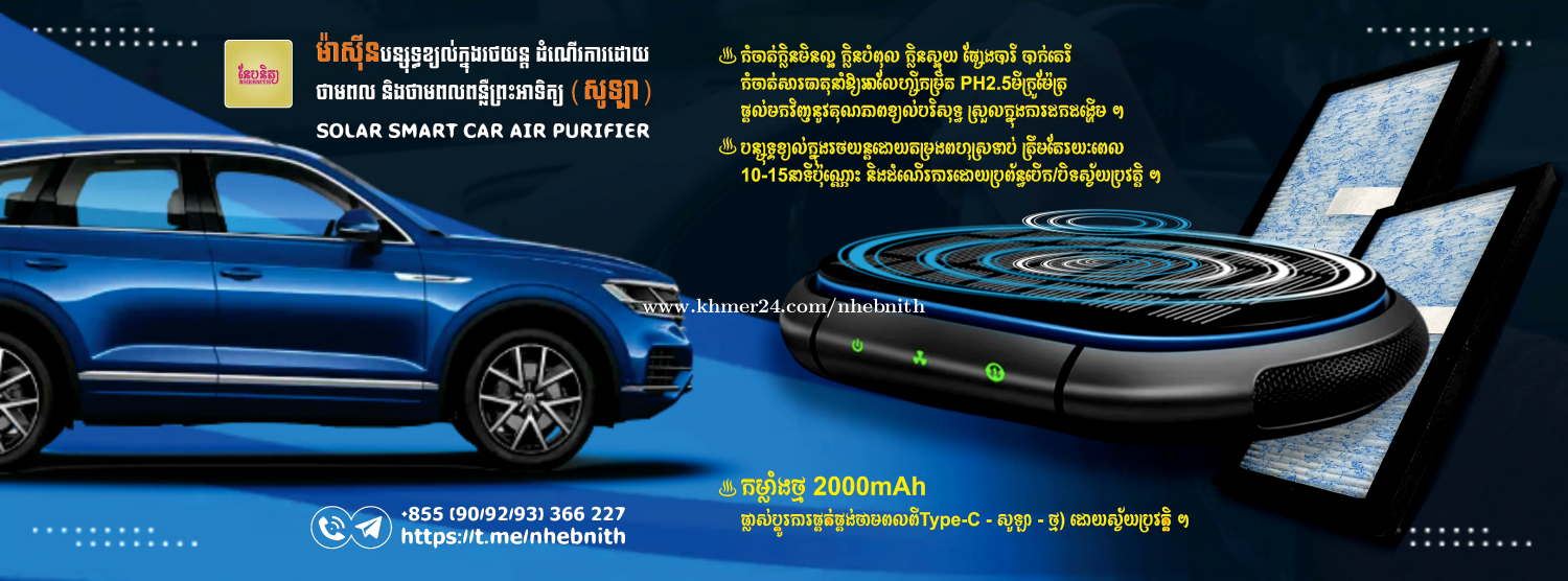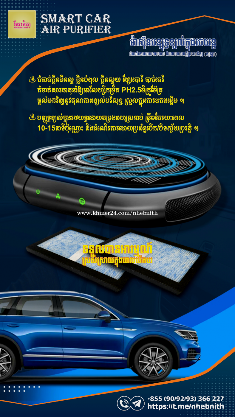 ♨️ Product Specification: » Product: Car Air Purifier » Weight: 0.58 kg » Airflow Rate: 20 m³/h » Coverage Area: 3-8 m³ » Solar Size: 5.51 x 2.95 inc » Battery Capacity: 2000 mAh » Filter Type: Composite Filter » Dimension: 7.40 x 4.29 x 1.42 inc ♨️ ក្នុងប្រអប់មាន៖ » ម៉ាស៊ីន : 1 » បន្ទះសូឡា : 1 » តម្រង : 1 ថែមជូន : 1 » ដុំឈើក្រអូប : 2 » ខ្សែរ USB -> Type-C : 1 » ដុំសាកថ្ម (ដោតកន្ទុយបារី) : 1 » បន្ទះស្អិត (បិតម៉ាស៊ីន) : 1