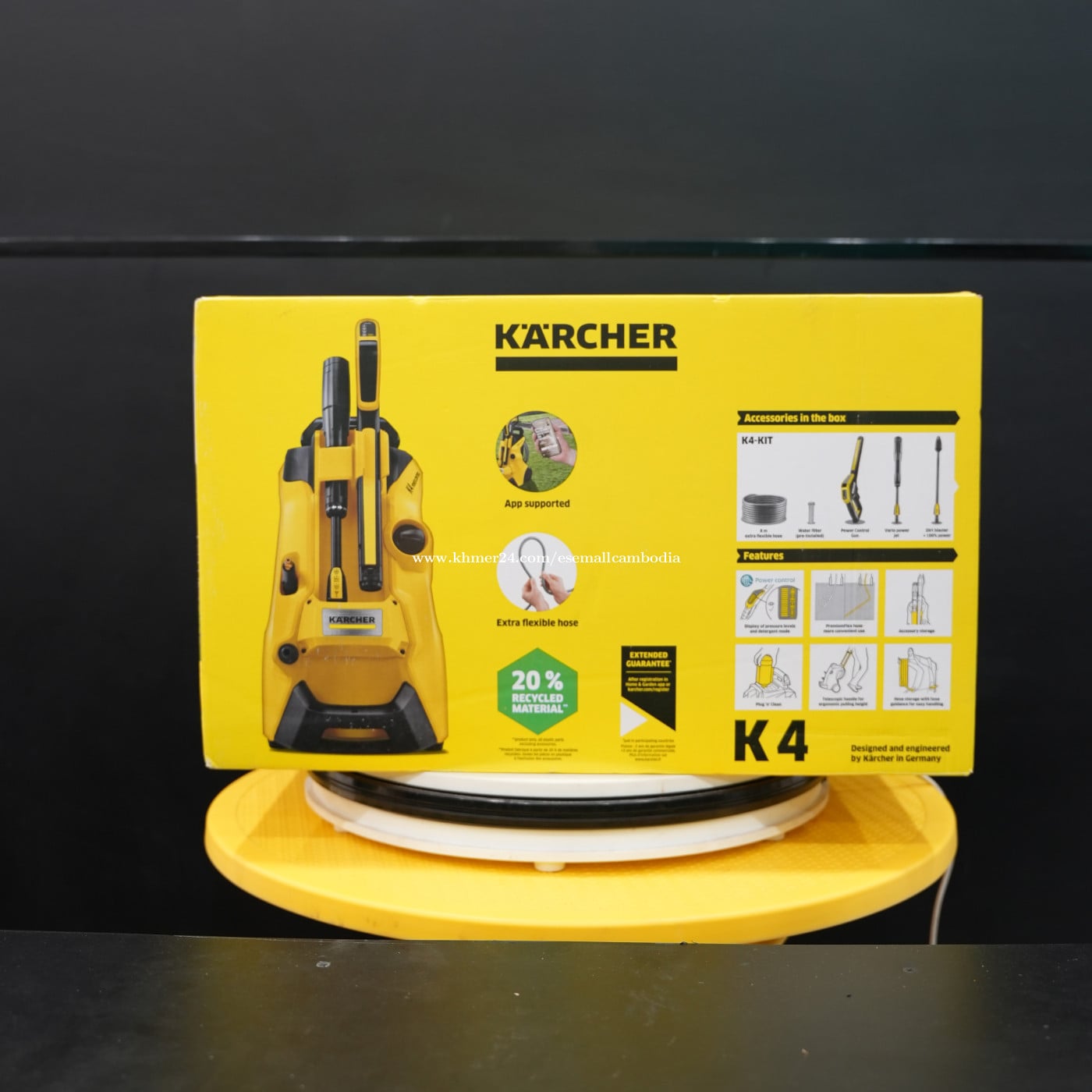 ម៉ាស៊ីនបាញ់ទឹកសម្ពាធខ្ពស់ KÄRCHER K4 (Pressure Washer) (1.324-300.0) តម្លៃ៖ $419.00 សភាព៖ ថ្មី 100% មានប្រអប់ដើម ប្រភេទ៖ ម៉ាស៊ីនបាញ់ទឹកសម្ពាធខ្ពស់ ម៉ាក៖ KÄRCHER ម៉ូដែល៖ K4 (K4 Kit) ពណ៌នាផលិតផល ម៉ាស៊ីនបាញ់ទឹកសម្ពាធខ្ពស់ KÄRCHER K4 គឺជាម៉ាស៊ីនគុណភាពខ្ពស់ ផលិត និងរចនានៅប្រទេសអាល្លឺម៉ង់ សមស្របសម្រាប់ការលាងរថយន្ត ម៉ូតូ ជញ្ជាំង ផ្លូវថ្ម បន្ទប់ក្រៅ និងការងារសម្អាតជុំវិញផ្ទះ។ មានកម្លាំងបាញ់ខ្លាំង ប៉ុន្តែប្រើងាយ សន្សំទឹក និងប្រើបានយូរ។ លក្ខណៈបច្ចេកទេស (Specifications) ប្រើភ្លើង៖ 220–240V ប្រភេទម៉ូទ័រ៖ Water-cooled motor សម្ពាធបាញ់៖ កម្លាំងខ្ពស់ សម្រាប់ការងារផ្ទះ និងពាណិជ្ជកម្មតូចៗ ខ្សែទឹក៖ បត់បែនងាយ (Extra flexible hose) រចនាប័ទ្ម៖ ងាយផ្ទុក ងាយផ្លាស់ទី គ្រឿងបន្លាស់ក្នុងប្រអប់ (K4 Kit) ដំបងបាញ់ទឹក កាំភ្លើងបាញ់ បំពង់បាញ់ Vario Power បំពង់ Dirt Blaster ខ្សែទឹក Filter និងគ្រឿងភ្ជាប់ដើម លក្ខណៈពិសេស កម្លាំងបាញ់ខ្លាំង លាងស្អាតលឿន រចនាឡើងសម្រាប់ប្រើប្រាស់យូរ សន្សំទឹក ប្រៀបធៀបនឹងបាញ់ទឹកធម្មតា គុណភាពអាល្លឺម៉ង់ សាកសមសម្រាប់ផ្ទះ ហាង និងការងារសម្អាតទូទៅ