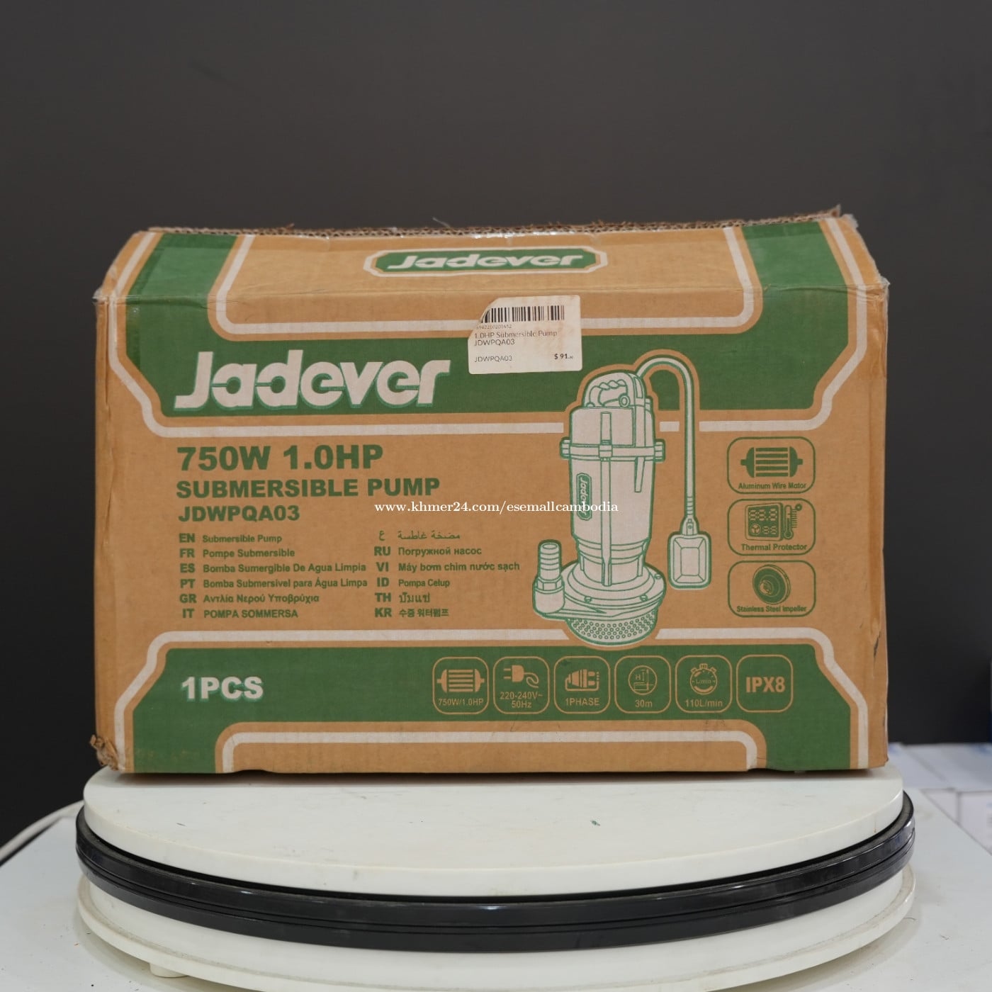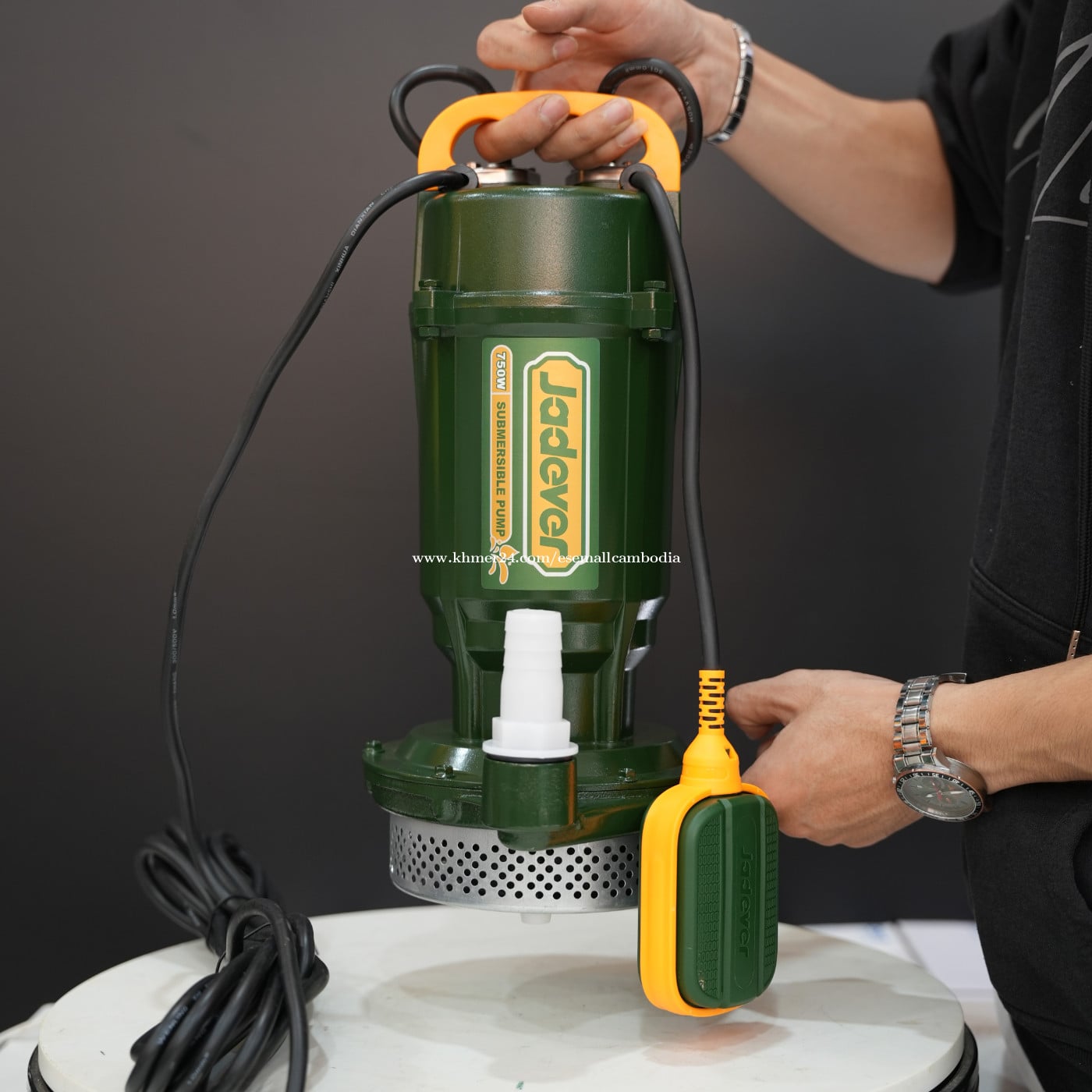 ម៉ាស៊ីនបូមទឹកលិចទឹក Jadever 750W (1.0HP) – ម៉ូដែល (JDWPQA03) ប្រភេទផលិតផល: ម៉ាស៊ីនបូមទឹកលិចទឹក (Submersible Pump) ម៉ាក: Jadever ម៉ូដែល: JDWPQA03 កម្លាំងម៉ាស៊ីន: 750W / 1.0HP ពណ៌នាផលិតផល ម៉ាស៊ីនបូមទឹកលិចទឹក Jadever 750W ត្រូវបានរចនាឡើងសម្រាប់បូមទឹកស្អាត ឬទឹកមានកាកតិចៗ ពីអណ្ដូង ទឹកជ្រៅ អាងទឹក ឬទីតាំងដែលត្រូវការបូមទឹកដោយដាក់ម៉ាស៊ីនចុះក្នុងទឹក។ មានគុណភាពរឹងមាំ ប្រើប្រាស់បានយូរ និងមានសុវត្ថិភាពខ្ពស់ ដោយមានប្រព័ន្ធការពារកំដៅ និងកុងតាក់អណ្តែតស្វ័យប្រវត្តិ។ លក្ខណៈបច្ចេកទេស (Specifications) ថាមពល៖ 750W / 1.0HP វ៉ុល៖ 220–240V / 50Hz ប្រភេទភ្លើង៖ 1 Phase កម្ពស់បូមអតិបរមា៖ ប្រហែល 30 ម៉ែត្រ អត្រាបូមទឹក៖ ប្រហែល 110 លីត្រ/នាទី កម្រិតការពារទឹក៖ IPX8 ប្រភេទម៉ូទ័រ៖ Aluminum Wire Motor ខ្សែភ្លើង៖ ភ្ជាប់មកជាមួយ ចំនួនក្នុងប្រអប់៖ 1 គ្រឿង លក្ខណៈពិសេស (Features) កុងតាក់អណ្តែត (Float Switch) ស្វ័យប្រវត្តិ បើក/បិទតាមកម្រិតទឹក ប្រព័ន្ធការពារកំដៅ (Thermal Protector) កង់បូម (Impeller) ដែកអ៊ីណុក រឹងមាំ មិនងាយច្រេះ សមស្របសម្រាប់អណ្ដូងទឹក អាងទឹក ស្រែចម្ការ និងការប្រើប្រាស់គ្រួសារ រចនាបថងាយកាន់ និងងាយដំឡើង