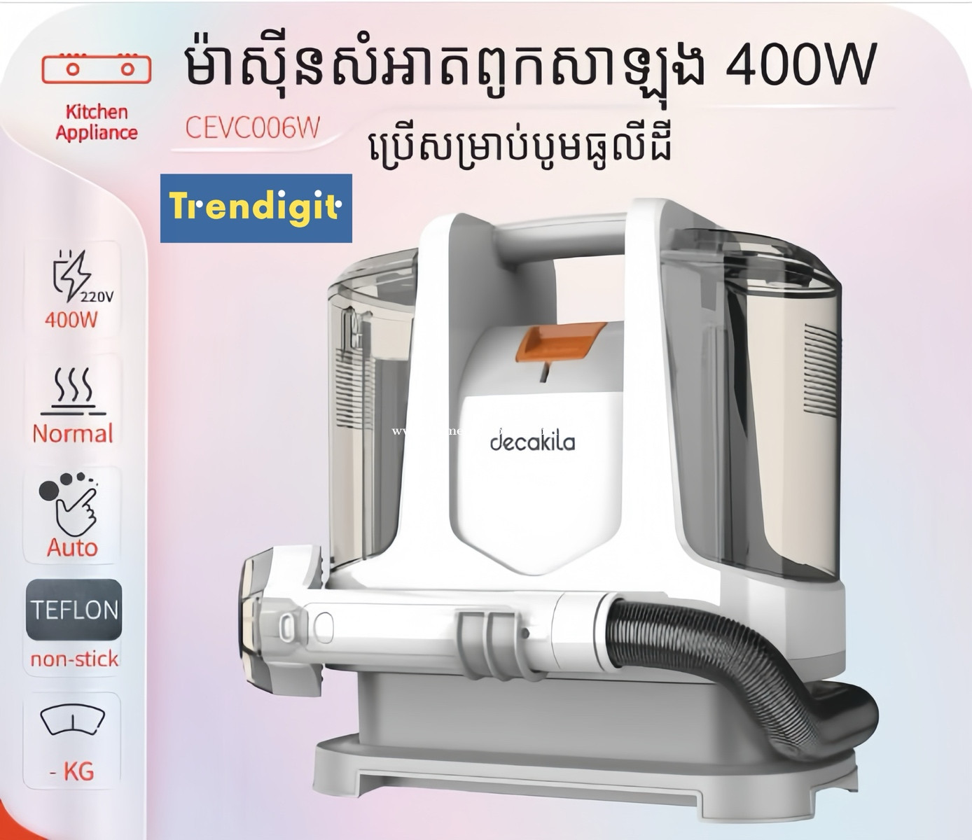 ម៉ាស៊ីនបូមធូលីដី និងសម្អាតម៉ាក DECAKILA ម៉ូឌែល CEVC006W ដែលអាចប្រើសម្រាប់សម្អាតពូក សាឡុង កម្រាលព្រំនាៗ និងអាវកម្ចាត់ស្នាមប្រឡាក់បានយ៉ាងល្អ 🛋️ 🫧✨ - កម្លាំង 400W - ចំណុះ 1.1L - ផលិតផលប្រទេសសិង្ហបុរី លោកអ្នកអាចស្វែងរកបាននៅ Trendigit-ដ្រេនឌីជីឌ! សូមចុចត្រង់នេះសម្រាប់ព័ត៌មានបន្ថែម 098877xxxClick To Call (Telegram) https://t.me/Trendigit_yi
