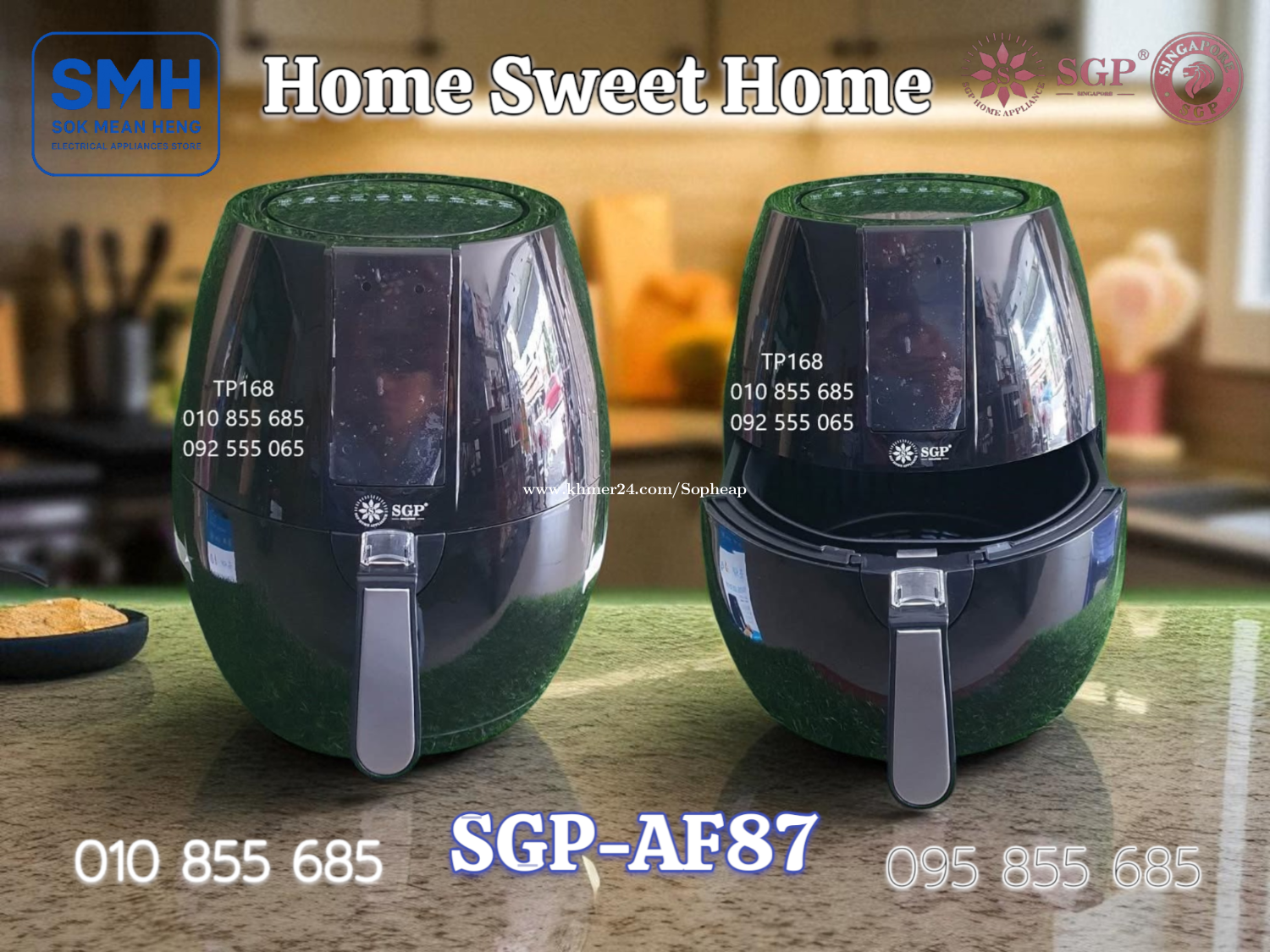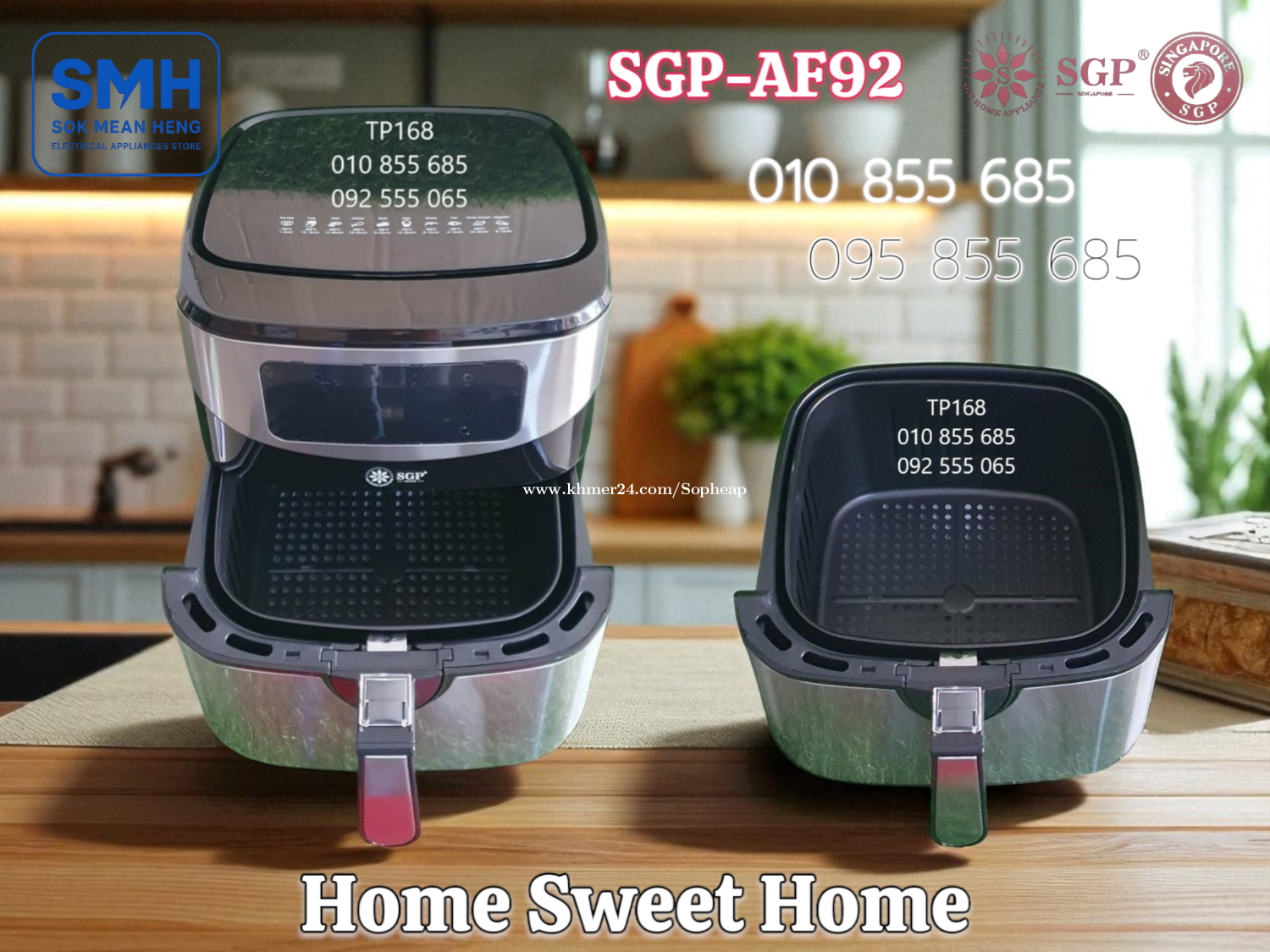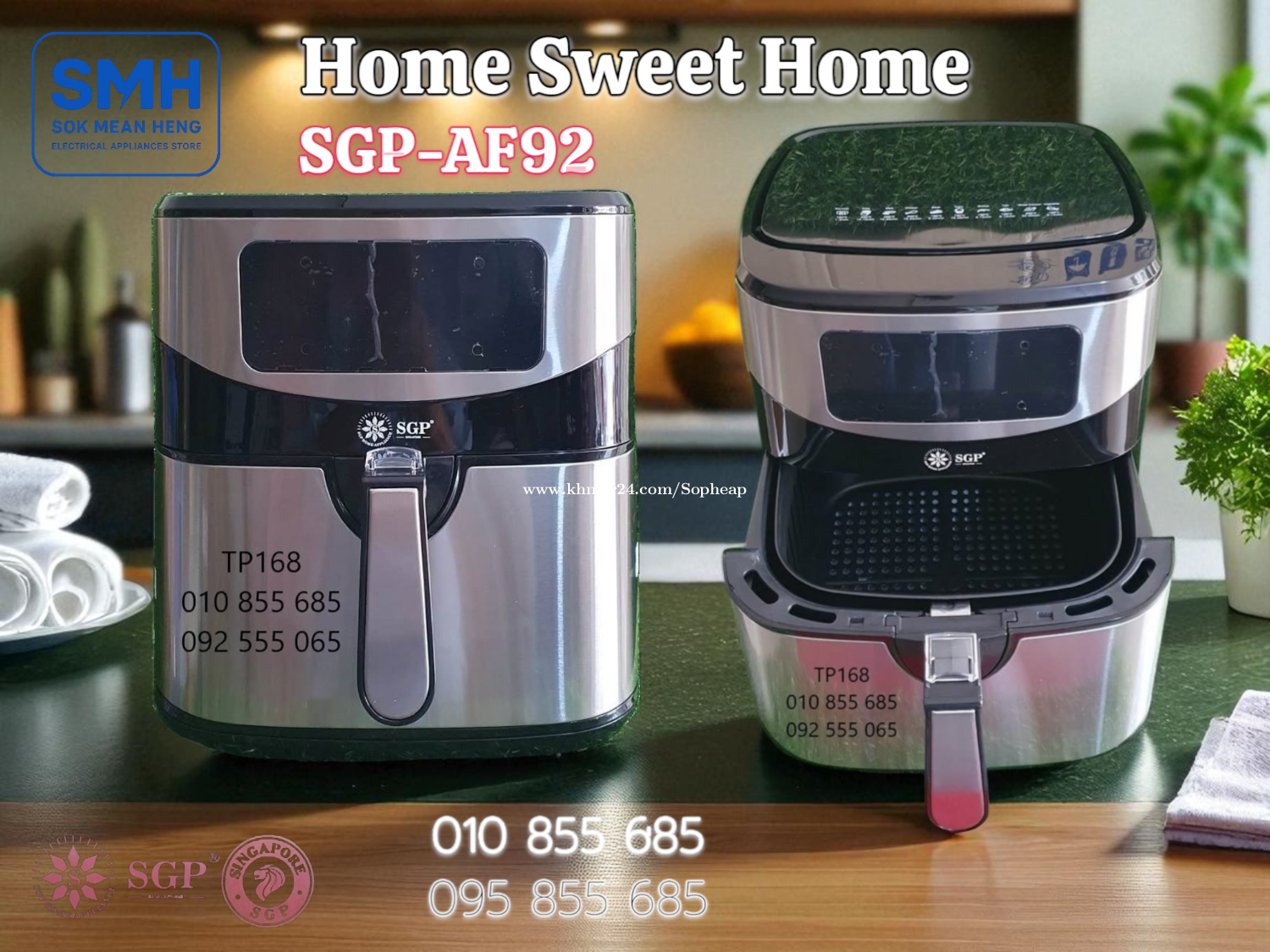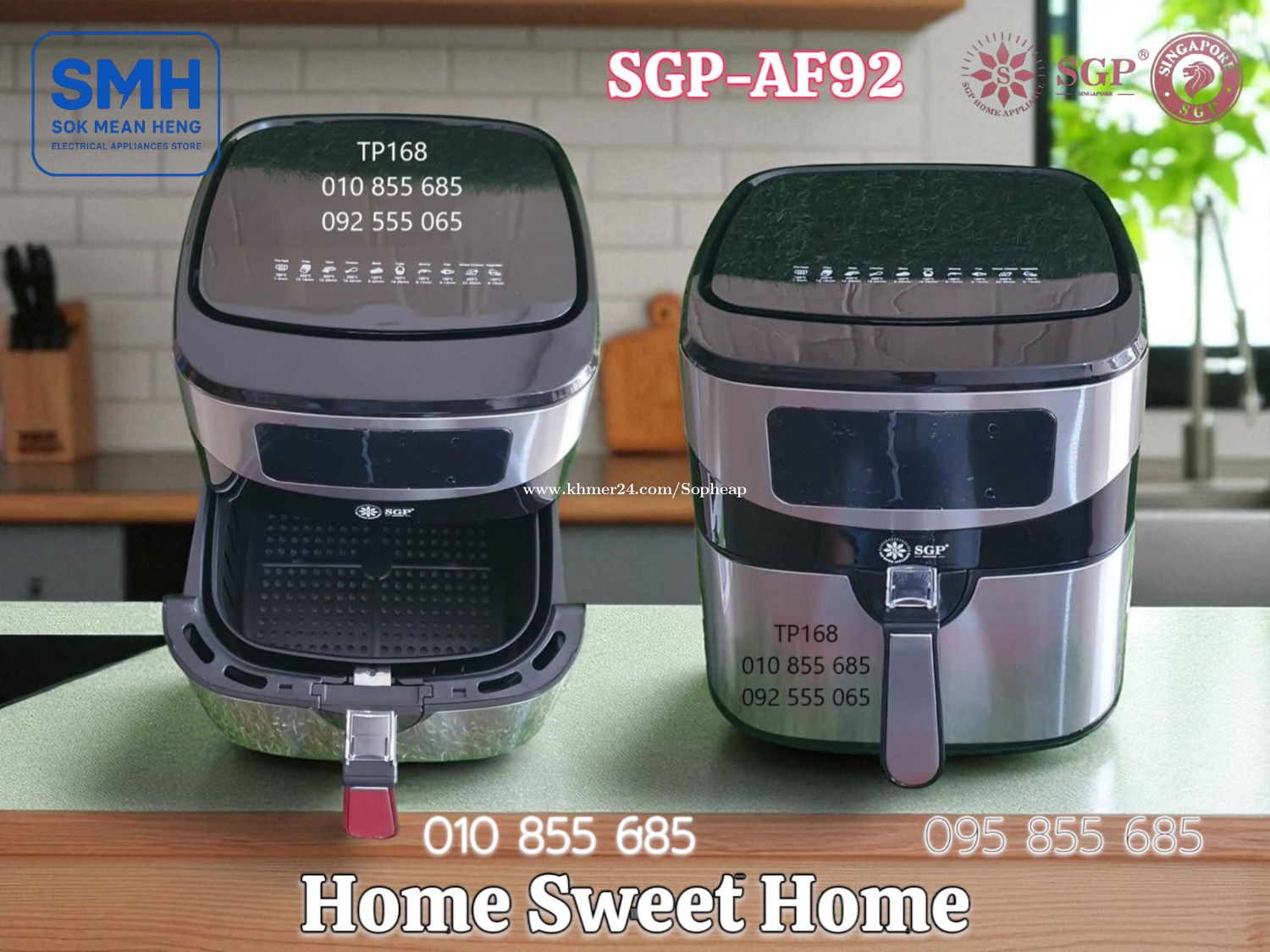 ម៉ាស៊ីនបំពងស្ងួត SGP 8.7L / 9.2L Air Fryer . - ផលិតផលប្រទេសសិង្ហបុរី / Product of Singapore - ជូយកាត់បន្ថយជាតិខ្លាញ់ និងភាពធាត់ បាន 80% - អាចចំអិន និងកំដៅម្ហូប បានគ្រប់ប្រភេទ . 1. ម៉ាស៊ីនបំពងស្ងួត SGP-AF87 Air Fryer (Air Oven) - Basket Capacity: 8.7L - Food Capacity: 7L - Power: 1600-1800W / 220-240V * Price / តំលៃ: 69$ . 2. ម៉ាស៊ីនបំពងស្ងួត SGP-AF92 Air Fryer (Air Oven) - Basket Capacity: 9.2L - Food Capacity: 7.2L - Power: 1600-1800W / 220-240V * Price / តំលៃ: 79$ . SMH / សុខ មាន ហេង / Sok Mean Heng ហាងលក់គ្រឿងប្រើប្រាស់អគ្គិសនី / Electrical Appliances Store . ✅ ហាងផ្លូវការដែលមានការទទួលស្គាល់ត្រឹមត្រូវដោយ Khmer24 / Verified Business Account by Khmer24 💯 ទទួលបានទំនុកចិត្តខ្ពស់ពីអតិថិជនជាច្រើន / Trusted by Real Customers. 📍 មានទីតាំងច្បាស់លាស់ និងពិតប្រាកដនៅភ្នំពេញ / We have a clear and real/verified location in Phnom Penh. . Phone / Telegram (សេវាកម្មរហ័ស / Fast Service): Smart: 010855xxxClick To Call / https://t.me/Annsopheap Cellcard: 095855xxxClick To Call / http://t.me/Annsopheap095 . អាស័យដ្ឋាន / Address: No. 392, MaoTseToung Blvd. (St. 245), Phnom Penh. (Near P Jolie Beauty Center) . ផែនទី / Maps: https://www.google.com/maps?q=11.55595844757693,104.90165490657091&15 . #ម៉ាស៊ីនបំពងស្ងួត #ឡបំពងស្ងួត #បំពងស្ងួត #សិង្ហបុរី #គ្រឿងអគ្គីសនី #គ្រឿងប្រើប្រាស់អគ្គិសនី #SGP #AirFryer #AirOven #Fryer #Oven #Singapore #SGP-AF87 #SGPAF87 #SGP-AF92 #SGPAF92 #SMH #Appliances #ApplianceStore #HomeAppaliance #ElectricAppliances #ElectricalAppliances #Promotion #Discount #Save #Free #New