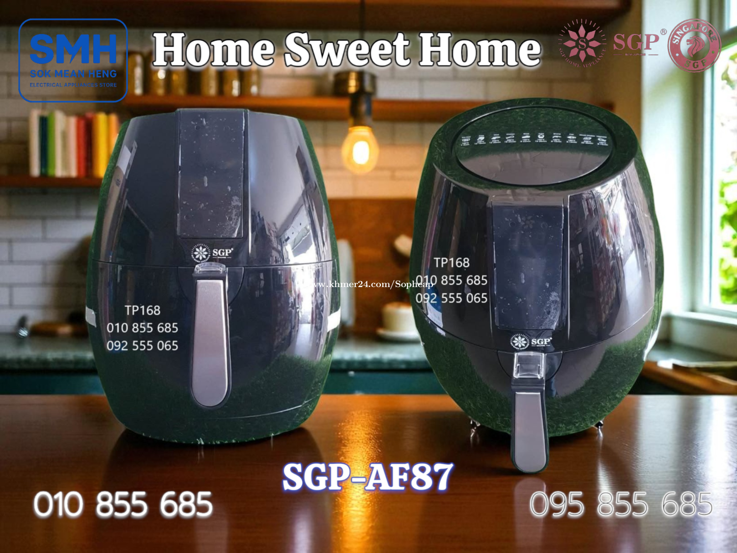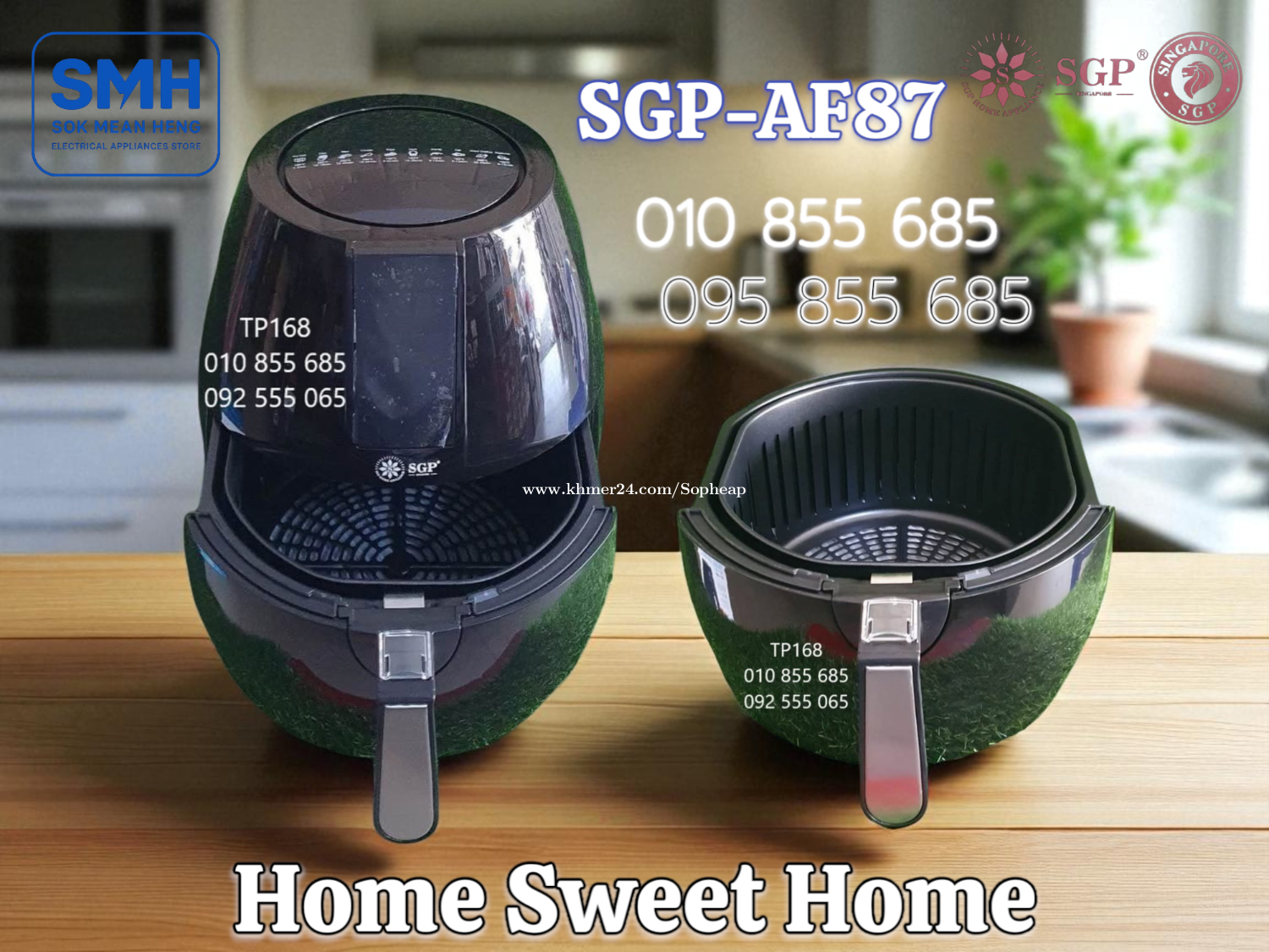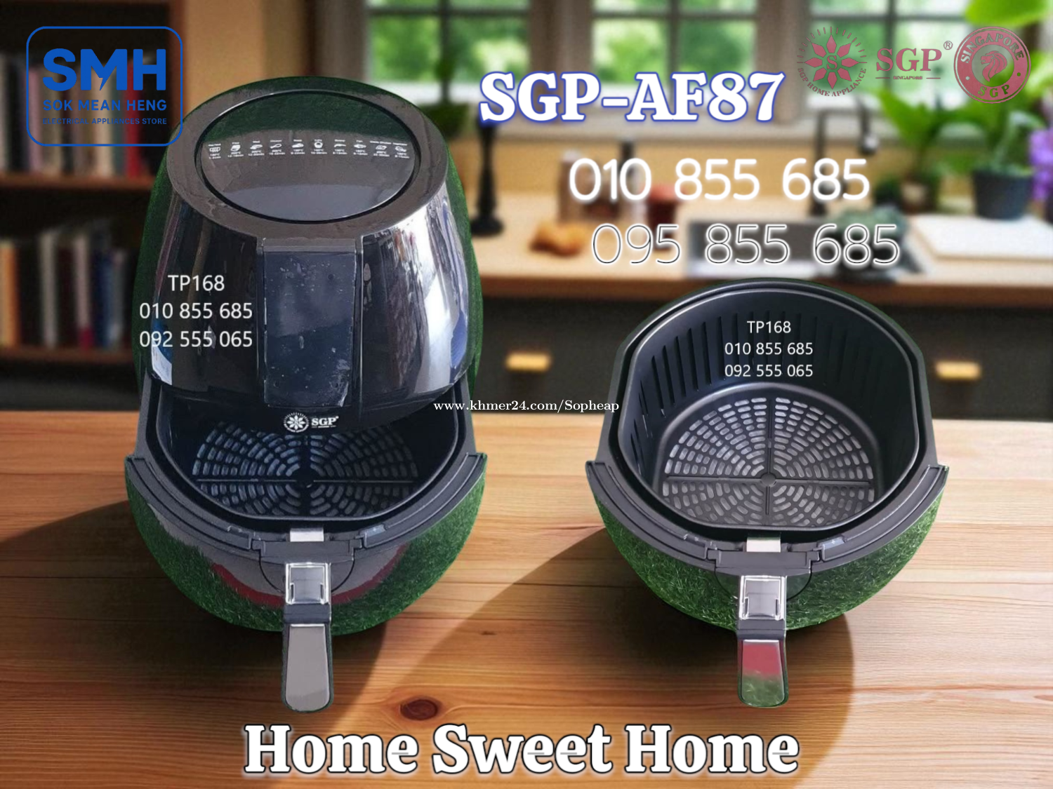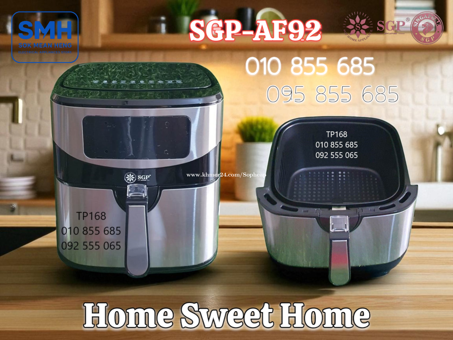 ម៉ាស៊ីនបំពងស្ងួត SGP 8.7L / 9.2L Air Fryer . - ផលិតផលប្រទេសសិង្ហបុរី / Product of Singapore - ជូយកាត់បន្ថយជាតិខ្លាញ់ និងភាពធាត់ បាន 80% - អាចចំអិន និងកំដៅម្ហូប បានគ្រប់ប្រភេទ . 1. ម៉ាស៊ីនបំពងស្ងួត SGP-AF87 Air Fryer (Air Oven) - Basket Capacity: 8.7L - Food Capacity: 7L - Power: 1600-1800W / 220-240V * Price / តំលៃ: 69$ . 2. ម៉ាស៊ីនបំពងស្ងួត SGP-AF92 Air Fryer (Air Oven) - Basket Capacity: 9.2L - Food Capacity: 7.2L - Power: 1600-1800W / 220-240V * Price / តំលៃ: 79$ . SMH / សុខ មាន ហេង / Sok Mean Heng ហាងលក់គ្រឿងប្រើប្រាស់អគ្គិសនី / Electrical Appliances Store . ✅ ហាងផ្លូវការដែលមានការទទួលស្គាល់ត្រឹមត្រូវដោយ Khmer24 / Verified Business Account by Khmer24 💯 ទទួលបានទំនុកចិត្តខ្ពស់ពីអតិថិជនជាច្រើន / Trusted by Real Customers. 📍 មានទីតាំងច្បាស់លាស់ និងពិតប្រាកដនៅភ្នំពេញ / We have a clear and real/verified location in Phnom Penh. . Phone / Telegram (សេវាកម្មរហ័ស / Fast Service): Smart: 010855xxxClick To Call / https://t.me/Annsopheap Cellcard: 095855xxxClick To Call / http://t.me/Annsopheap095 . អាស័យដ្ឋាន / Address: No. 392, MaoTseToung Blvd. (St. 245), Phnom Penh. (Near P Jolie Beauty Center) . ផែនទី / Maps: https://www.google.com/maps?q=11.55595844757693,104.90165490657091&15 . #ម៉ាស៊ីនបំពងស្ងួត #ឡបំពងស្ងួត #បំពងស្ងួត #សិង្ហបុរី #គ្រឿងអគ្គីសនី #គ្រឿងប្រើប្រាស់អគ្គិសនី #SGP #AirFryer #AirOven #Fryer #Oven #Singapore #SGP-AF87 #SGPAF87 #SGP-AF92 #SGPAF92 #SMH #Appliances #ApplianceStore #HomeAppaliance #ElectricAppliances #ElectricalAppliances #Promotion #Discount #Save #Free #New