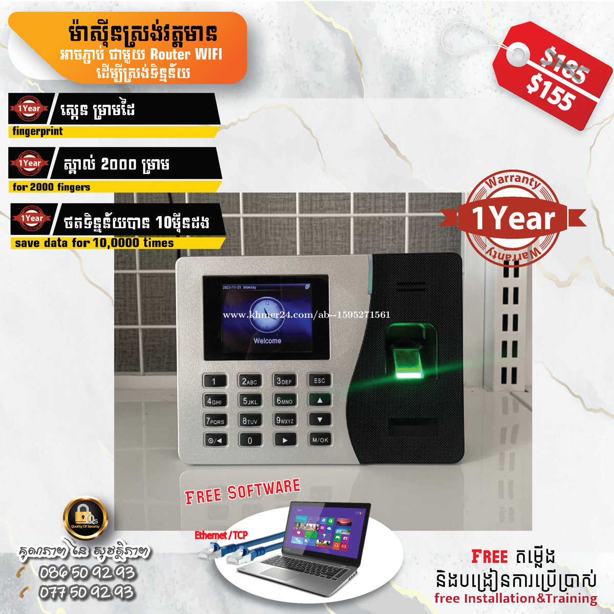 ⏰មាស៊ីនស្រង់វត្តមានបុគ្គលិក⏳ Time attendance recorder ✅ប្រើក្រយៅដៃដើម្បីស្កេន (Finger Print) ✅ប្រើការស្កេនមុខ (Face Scan) ✅ប្រើម្រាមដៃបានចាប់ពី ៥០០ម្រាម រហូតដល់ ២០០០ម្រាម និង ប្រើមុខស្កេនបាន ដល់ទៅ១០០០អ្នក (Available for 500fingers to 2000fingers and 1000faces scanner) ✅ស្រង់ទន្និន័យបានដល់ទៅ៥០០០០ ដល់ ២០០០០០ដង(Record Data storage 50000times to 200000times) ✅ធានាជូនរយះពេល១ឆ្នាំពេញ (Warranty 1year🥇)🎁 ✅តម្លើងម៉ាស៊ីន និងបង្រៀនការប្រើប្រាស់ជូនដោយឥតគិតថ្លៃ(🎁Free Installation and Training) ✅ផ្តល់កម្មវិធីប្រើប្រាស់ដោយឥតគិតថ្លៃ(🎁Free Software) 📍ទីតាំងស្ថិតនៅ ផ្ទះលេខ C62 ចោមចៅ ពោធ៏សែនជ័យ រាជធានាភ្នំពេញ 🌍 https://bit.ly/3BJguTz 📞 086509xxxClick To Call Smart 📞 077509xxxClick To Call Cellcard