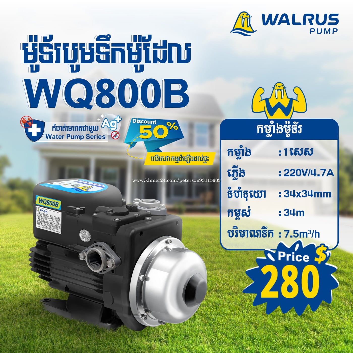 ម៉ូទ័រជម្រុញទឹកដោយស្វ័យប្រវត្តិម៉ាក Walrus សម្លេងស្ងាត់ កម្លាំងទឹកខ្លាំង សន្សំសំចៃច្រើនទ្វេដង ការពារការលិចជ្រាប និងសម្លាប់មេរោគ🦠💪 Discount: 50% លើសេវាកម្មដំឡើងដល់ផ្ទះ ✅ មានការធានារយៈពេល1ឆ្នាំ 👉 សម្រាប់ព័ត៌មានបន្ថែមសូមទំនាក់ទំនង៖ 📲 0969376xxxClick To Call / 012908xxxClick To Call