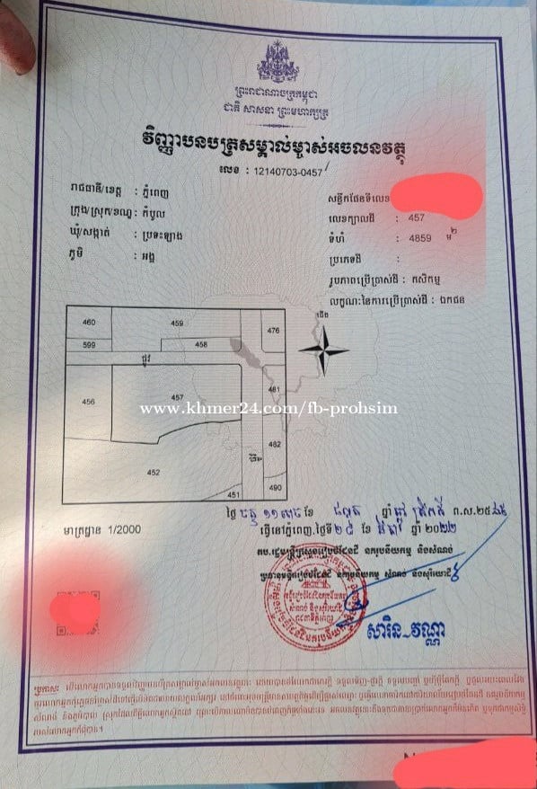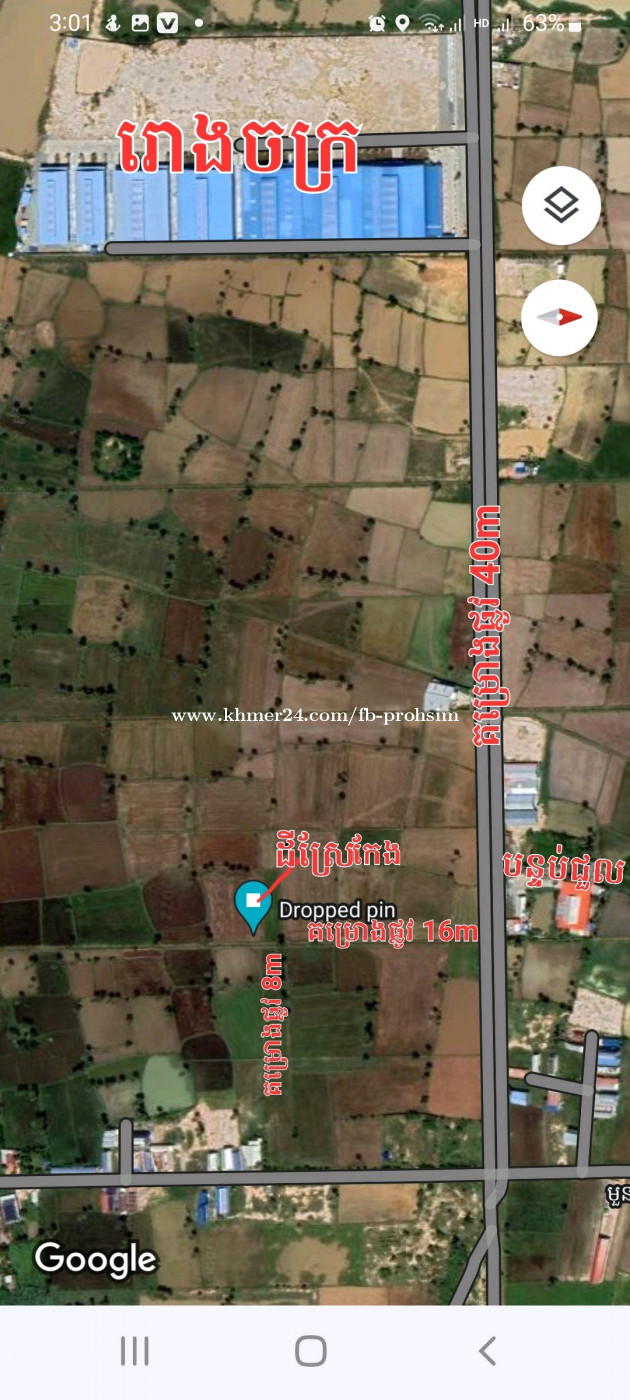 ដីស្រែកែង ផ្លូវប្រឡាយ16 ម៉ែត្ រនិង 8 ម៉ែត្រ។ នៅភូមិអង្គ សង្កាត់ប្រទះឡាង ខណ្ឌកំបូលរាជធានីភ្នំពេញ។ ** ក្បាល 49 ម៉ែត្រ បែរមុខទៅកើត កន្ទុយ 60 ម៉ែត្រ **បណ្តោយ 106 ម៉ែត្រ ** ទំហំ 4859 ម៉ែត្រការ៉េ **87 $ ក្នុងមួយម៉ែត្រការ៉េ ចរចា **ប្លង់រឹង *ជិតរោងចក្រ 6 អរគារ កំពុងដំណើរការ *រោងចក្រ 2 ទៀតទើបតែដំណើរការ *ជិត តំបន់សេដ្ឋកិច្ចពិសេស *ជិតបុរី ព្រៃសំព័រ បើបងប្អូនមានចំណាប់អារម្មណ៍អាចទំនាក់ទំនងមកខ្ញុំម្ចាស់ដីផ្ទាល់ តាមរយៈ *** 012387xxxClick To Call cellcard ***087859xxxClick To Call smart មាន Telegram ទាំងពីរខ្សែ