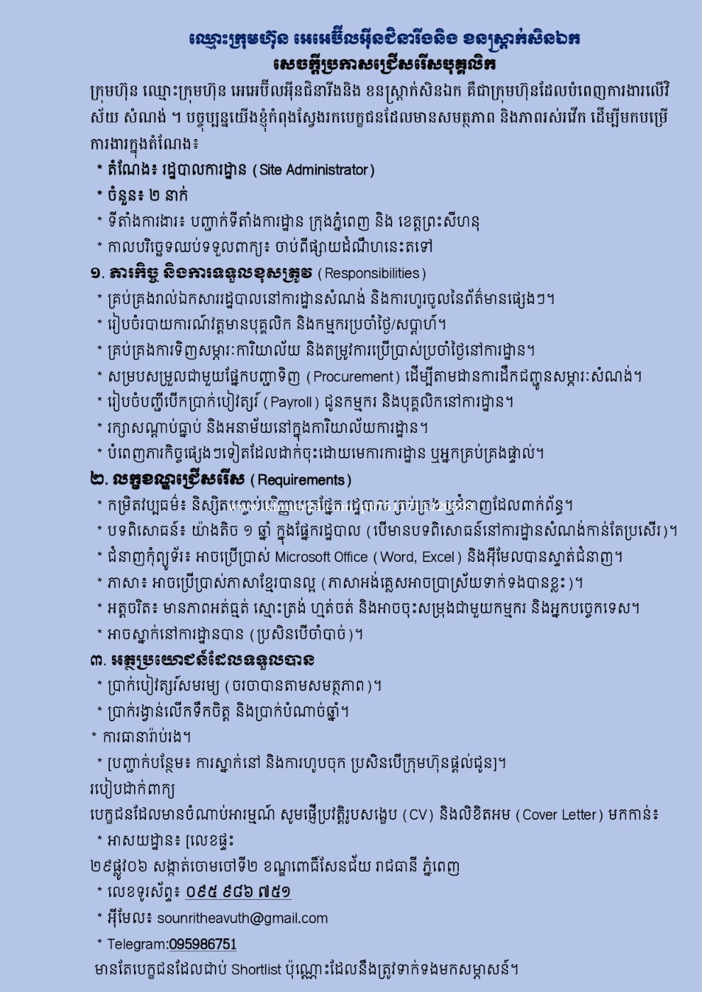 ឈ្មោះក្រុមហ៊ុន អេអេប៊ីលអ៊ីនជិនារីងនិង ខនស្ត្រាក់សិនឯក សេចក្តីប្រកាសជ្រើសរើសបុគ្គលិក ក្រុមហ៊ុន ឈ្មោះក្រុមហ៊ុន អេអេប៊ីលអ៊ីនជិនារីងនិង ខនស្ត្រាក់សិនឯក គឺជាក្រុមហ៊ុនដែលបំពេញការងារលើវិស័យ សំណង់ ។ បច្ចុប្បន្នយើងខ្ញុំកំពុងស្វែងរកបេក្ខជនដែលមានសមត្ថភាព និងភាពរស់រវើក ដើម្បីមកបម្រើការងារក្នុងតំណែង៖ * តំណែង៖ រដ្ឋបាលការដ្ឋាន (Site Administrator) * ចំនួន៖ ២ នាក់ * ទីតាំងការងារ៖ បញ្ជាក់ទីតាំងការដ្ឋាន ក្រុងភ្នំពេញ និង ខេត្តព្រះសីហនុ * កាលបរិច្ឆេទឈប់ទទួលពាក្យ៖ ១. ភារកិច្ច និងការទទួលខុសត្រូវ (Responsibilities) * គ្រប់គ្រងរាល់ឯកសាររដ្ឋបាលនៅការដ្ឋានសំណង់ និងការហូរចូលនៃព័ត៌មានផ្សេងៗ។ * រៀបចំរបាយការណ៍វត្តមានបុគ្គលិក និងកម្មករប្រចាំថ្ងៃ/សប្តាហ៍។ * គ្រប់គ្រងការទិញសម្ភារៈការិយាល័យ និងតម្រូវការប្រើប្រាស់ប្រចាំថ្ងៃនៅការដ្ឋាន។ * សម្របសម្រួលជាមួយផ្នែកបញ្ជាទិញ (Procurement) ដើម្បីតាមដានការដឹកជញ្ជូនសម្ភារៈសំណង់។ * រៀបចំបញ្ជីបើកប្រាក់បៀវត្សរ៍ (Payroll) ជូនកម្មករ និងបុគ្គលិកនៅការដ្ឋាន។ * រក្សាសណ្តាប់ធ្នាប់ និងអនាម័យនៅក្នុងការិយាល័យការដ្ឋាន។ * បំពេញភារកិច្ចផ្សេងៗទៀតដែលដាក់ចុះដោយមេការការដ្ឋាន ឬអ្នកគ្រប់គ្រងផ្ទាល់។ ២. លក្ខខណ្ឌជ្រើសរើស (Requirements) * កម្រិតវប្បធម៌៖ និស្សិតបញ្ចប់បរិញ្ញាបត្រផ្នែក រដ្ឋបាល គ្រប់គ្រង ឬជំនាញដែលពាក់ព័ន្ធ។ * បទពិសោធន៍៖ យ៉ាងតិច ១ ឆ្នាំ ក្នុងផ្នែករដ្ឋបាល (បើមានបទពិសោធន៍នៅការដ្ឋានសំណង់កាន់តែប្រសើរ)។ * ជំនាញកុំព្យូទ័រ៖ អាចប្រើប្រាស់ Microsoft Office (Word, Excel) និងអ៊ីមែលបានស្ទាត់ជំនាញ។ * ភាសា៖ អាចប្រើប្រាស់ភាសាខ្មែរបានល្អ (ភាសាអង់គ្លេសអាចប្រាស្រ័យទាក់ទងបានខ្លះ)។ * អត្តចរិត៖ មានភាពអត់ធ្មត់ ស្មោះត្រង់ ហ្មត់ចត់ និងអាចចុះសម្រុងជាមួយកម្មករ និងអ្នកបច្ចេកទេស។ * អាចស្នាក់នៅការដ្ឋានបាន (ប្រសិនបើចាំបាច់)។ ៣. អត្ថប្រយោជន៍ដែលទទួលបាន * ប្រាក់បៀវត្សរ៍សមរម្យ (ចរចាបានតាមសមត្ថភាព)។ * ប្រាក់រង្វាន់លើកទឹកចិត្ត និងប្រាក់បំណាច់ឆ្នាំ។ * ការធានារ៉ាប់រង។ * [បញ្ជាក់បន្ថែម៖ ការស្នាក់នៅ និងការហូបចុក ប្រសិនបើក្រុមហ៊ុនផ្តល់ជូន]។ របៀបដាក់ពាក្យ បេក្ខជនដែលមានចំណាប់អារម្មណ៍ សូមផ្ញើប្រវត្តិរូបសង្ខេប (CV) និងលិខិតអម (Cover Letter) មកកាន់៖ * អាសយដ្ឋាន៖ [លេខផ្ទះ ២៩ផ្លូវ០៦ សង្កាត់ចោមចៅទី២ ខណ្ឌពោធិ៍សែនជ័យ រាជធានី ភ្នំពេញ * លេខទូរស័ព្ទ៖ ០៩៥ ៩៨៦ ៧៥១ * អ៊ីមែល៖ sou***********@gmail.comClick To Sent Email * Telegram:095986xxxClick To Call មានតែបេក្ខជនដែលជាប់ Shortlist ប៉ុណ្ណោះដែលនឹងត្រូវទាក់ទងមកសម្ភាសន៍។