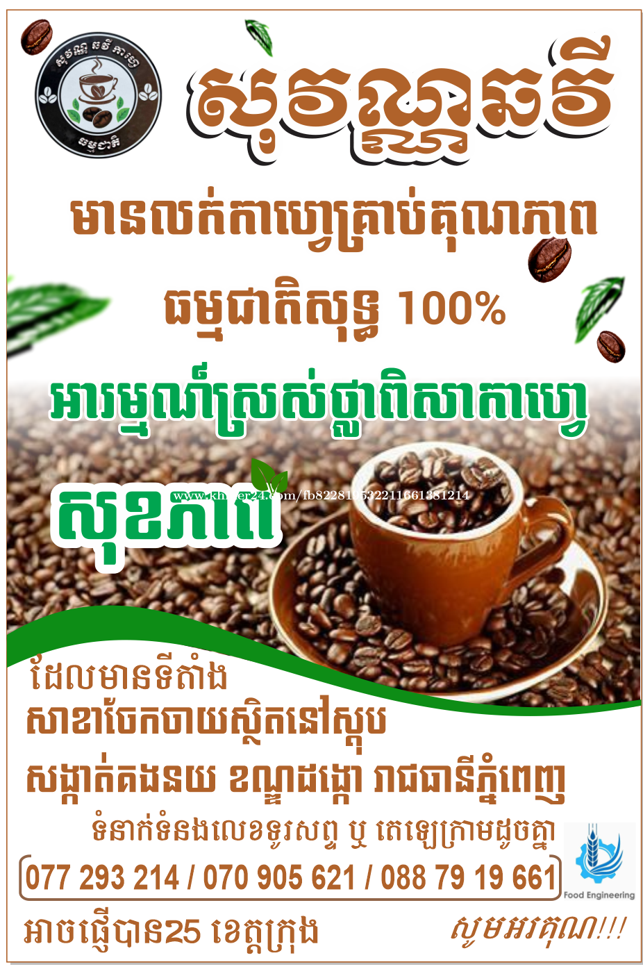 រាល់ការកម្មង់គ្រាប់កាហ្វេធម្មជាតិ នឹងតែក្រហម+តែបៃតង+កាហ្វេហ្វីនពីរខាងយើងខ្ញុំនិងដឹកជញ្ជូនហ្វី ដើម្បីចូលរួមលើកស្ទួយ ផលិតផលខ្មែ ថែមលើសពីនឹងទៀតខាងអូនមានលក់ម៉ាស៊ីនឆុងកាហ្វេ នឹងកិនកាហ្វេម៉ាស៊ីនក្រឡុកំល្អៗ សូមទំនាក់ទំនងមកកាន់លេខដូចខាងក្រោម : ០៧៧២៩៣២១៤ ០៨៨៧៩១៩៦៦១ ០៧០៩០៥៦២១ ០៩៧៤៦៨៧១៥៩