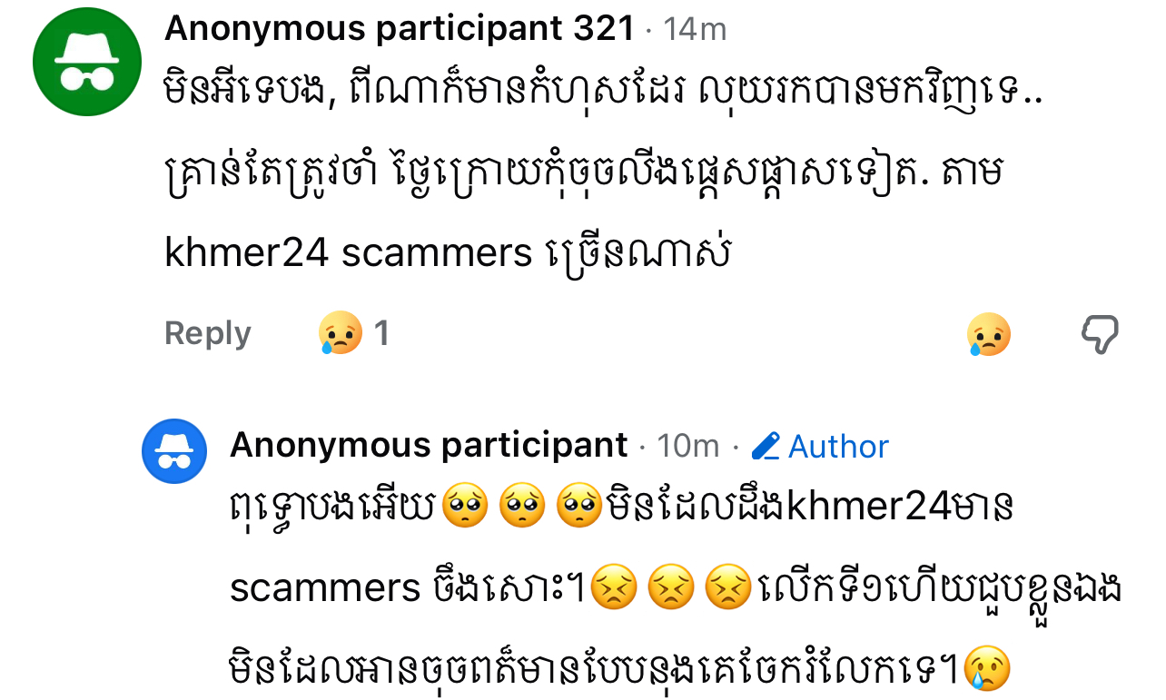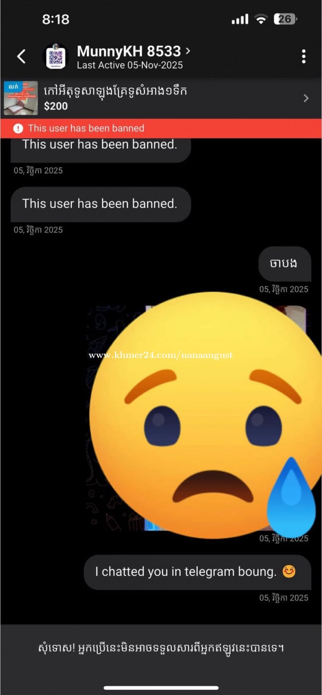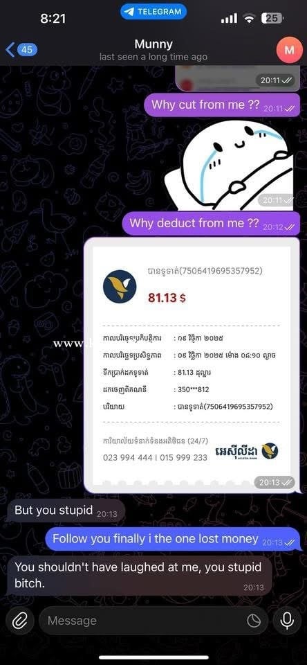 #ខ្ញុំសូមចែករំលែករឿងគេបោកខ្ញុំបានឡេីយផុយមួយបងៗ🥺😢😰។ខ្ញុំបានផុសលក់អីវ៉ាន់ក្នុងផេកKhmer24ហេីយមានសត្វឆ្កែ ឆាតមកអោយadd telegram។ថ្ងៃនេះសត្វឆ្កែបានតបchat telegramខ្ញុំ។វាសួរខ្ញុំតំលៃចុងក្រោយប៉ុន្មានខ្ញុំថា១២០$(វាឆាតជាភាសាអង់គ្លេសសុទ្ធហេីយអត់មាន តថ្លៃ ចុះឡេីងៗអីទេ😩)ហេីយសត្វនោះប្រាប់ថាវាចង់អោយដឹកទៅតាកែវ។វាថាអោយBest Expressដឹកទៅអោយ។វាសុំតែអាស័យដ្ធានមកវាចុចapplyតាមwebsiteអោយក្រុមហ៊ុនBest Expressនុងគេធ្វេីការជាមួយខ្ញុំ(ខ្ញុំអត់មានចាប់អារម្មណ័រឿងlinkអីនុងម៉ាតិចម៉ង)វាក៏ផ្ញេីរlinkមកអោយខ្ញុំដេីម្បីបានលុយថ្លៃអីវ៉ាន់តាមlink😖។ខ្ញុំចុចតាមlinkអោយselect bank account, account number, phone number ហេីយមានលេខកូដផ្ញេីរមកmy phone number។ ខ្ញុំ select Wing bank and follow the instructions ហេីយwing notification ថាខ្ញុំអត់មានលុយគ្រប់គ្រាន់ (ខ្ញុំភាំងឆោតសាហាវជាអ្នកលក់សោះចុចថាអត់មានលុយគ្រប់គ្រាន់ហេីយនឹងអត់ចាប់អារម្មណ៏ទៀតភ្លេីខ្លាំងងងងងងងង)។ខ្ញុំក៏នឹកឃេីញwing no money i change to ACeleda (យាយទៅភាំង១ភ្លេតភ្លេីល្ងង់ខ្លាំងៗអត់ចាប់អារម្មណ៏រឿងបោកតាមonlineម៉ាតិចម៉ង)after i apply passwordតាមlinkហេីយលុយបានកាត់ពីកុងខ្ញុំតែម្តងគឺចំនួន81.13$មិនមែន120$ទេ🥺😢😭។ បងៗអេីយស្លុតចិត្តប្រេីFB,khmer24 តាំង 2009មកទិញអីវ៉ាន់គេរាប់រយដងមិនដែលគេបោកទេ។ចេញលក់សំភារះក្នុងផ្ទះមួយទឹកម្តងគេបោកឡេីងស្រួល។😭😭😭 #មេរៀនល្ងង់ខ្លាំងស្គាល់ពាក្យគេបោកScam😢