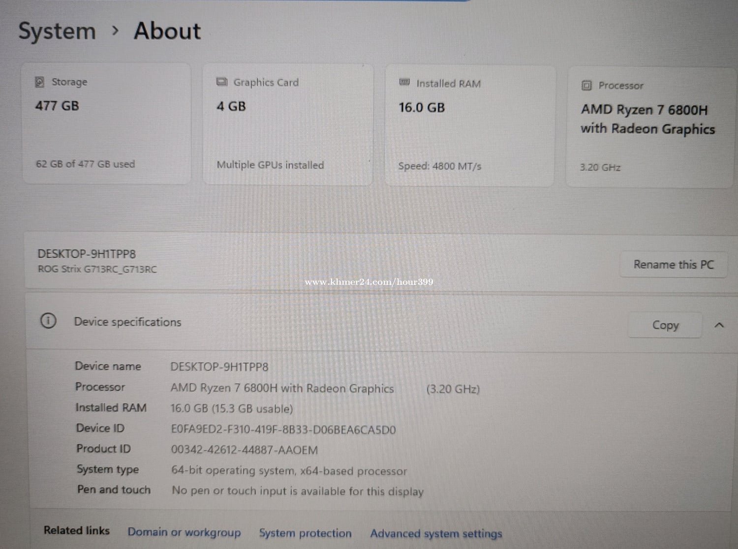 Asus Rog Strix G17 G713RCថ្មី99.5% Ryzen 7 6800H 3.2GHz 16cpu (=Core i7-12700H) RAM: 16GB DDR5 4800Mhz upgradable to 32GB NVMe M.2 PCIe 512G 17.3" FHD IPS 144Hz VGAដាច់RTX 3050 4GB GDDR6ឡើង12GB ឃីភ្លើងKeyboard 4 zone RGB Excellent sound WiFi 6E Battery 56WHrs ថ្ម3-5ម៉ោង adapter 200W, Support Type C fast charge Windows license ដើម្បីតបរហ័សសូមទាក់ទងtelegram: https://t.me/Lyn88998 0318888xxxClick To Call