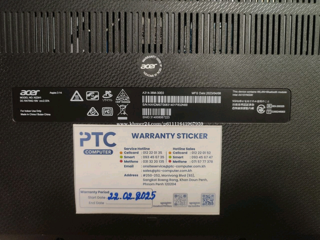 Acer Aspire A314-36M 99.99% DDR5 លឿន ធានាពី PTC ពីថ្ងៃទី 22/02/2025 ផលិត 2023/04/08 Core i3-N305 ជំនាន់ទី13 (8CPUs)1.8GHz up to 3.8GHz ល្បឿនលឿន RAM 4GB DDR5 4800 256GB PCIE M.2 ល្បឿនលឿន2.7G 14” FHD anti glare HD Camera clear WiFi6 ថ្ម42W 5-8ម៉ោង battery 42W 5-8hours original adapter 1.4 kg ម៉ាស៊ីនលឿនខ្លាំង ទាក់ទងtelegram ដើម្បីតបរហ័ស: https://t.me/MY76886 0765888xxxClick To Call Cellcard