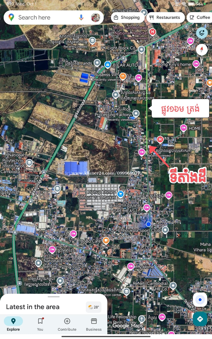 ដីលក់ 👍ទំហំ : 10×36m : 368ម² ប្លង់រឹង 👍ទីតាំង : ផ្លូវ ១៦ម ផ្លូវមិនទាល់ ចាក់ត្រង់ពីផ្លូវ 2011(ជិតសាលាសង្កាត់) ដល់ទំនប់កប់ស្រូវ ចំមុខពេទ្យតេជោ 👍ស្ថានភាព : ក្បែរទីប្រជុំជន - 1km ពីផ្សារឈូកវ៉ា១, - 100m ពីសង្កាត់គោករកា, ប៉ុស្តិ៍នគរបាល, មន្ទីរពេទ្យបង្អែក - 2km ពីបូរីមេគង្គលែន - 3km បូរីខនដូរសែនសុខជាដើម។ល។ - ខ្នាតវីឡា, ឃ្លាំង, ហ្គារាស ឬផ្ទះអាជីវកម្ម បន្ទប់ជួល 🤟តម្លៃលក់ : 140000$ 👌ទីតាំង https://maps.app.goo.gl/uMjbYuwgnoPbjcdHA ⚠️Telegram: 010996xxxClick To Call / 099969xxxClick To Call / 087607xxxClick To Call