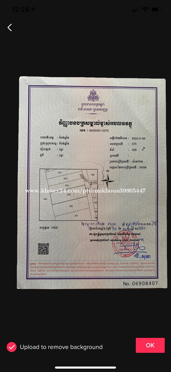 ដីលក់បន្ទាន់ (ដីម្ចាស់ផ្ទាល់ ) -ដីលក់ (Sale) - ចុះពីសាលាខេត្តប្រហែល 500m នៅទីប្រជុំជន ក្បែរមន្ទីពេទ្យខេត្ត ក្បែរវិទ្យាល័យ វិទ្យាស្ថាន ក្បែរផ្សារលើកំពង់ឆ្នាំង - ក្បាលដី 10 ម៉ែត្រ ជាប់ផ្លូវបេតុង 4 m ក្បែរផ្លូវចូលតាមវត្ត ក្តីត្នោត - ដីទំហំ 305 ម៉ែត្រការ៉េ - សាកសមជាមួយការធ្វើបន្ទប់ជួល សាងសងផ្ទះ ...... - នៅភូមិ ប្អេរ សង្កាត់ ប្អេរ ក្រុង កំពង់ឆ្នាំង ខេត្ត កំពង់ឆ្នាំង - តម្លៃ: 2xxxx (ចចារ) លេខទូរស័ព្ទ:0962341xxxClick To Call/0973241xxxClick To Call លេខតេលេក្រាម: 0963241xxxClick To Call