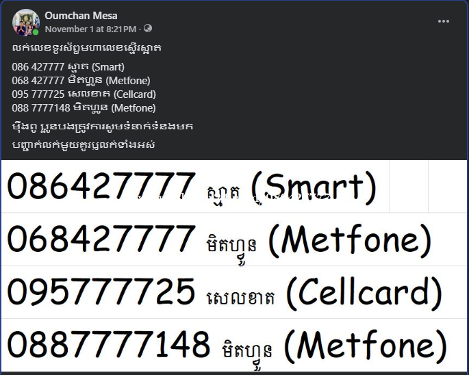 លក់លេខទូរស័ព្ធមហាពិសេសលើលោកគ្មានពីរ បងប្អូនពូម៉ីងចង់បានសូមទំនាក់ទំនងមកលេខខាងក្រោម ហ្វ្រីកាត់ឈ្មោះ *លក់ជាគូរ : 086/068 - 427777 = 3000$ 095 7777 25 = 600$ 088 7777 148 = 120$