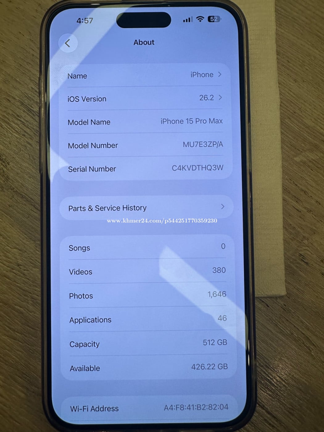 ទូរសព្ទ iphone 15 pro max 1 ទឹក. ថ្មរ Maximum Capacity: 78%.