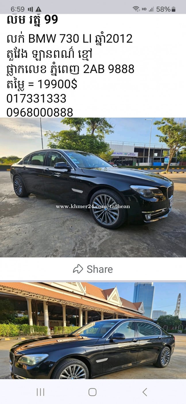 លក់ BMW 730 LI ឆ្នាំ2012 តួវែង ឡានពណ៌ ខ្មៅ ផ្លាកលេខ ភ្នំពេញ 2AB 9888 តម្លៃ = 19900$ 017331xxxClick To Call 0968000xxxClick To Call
