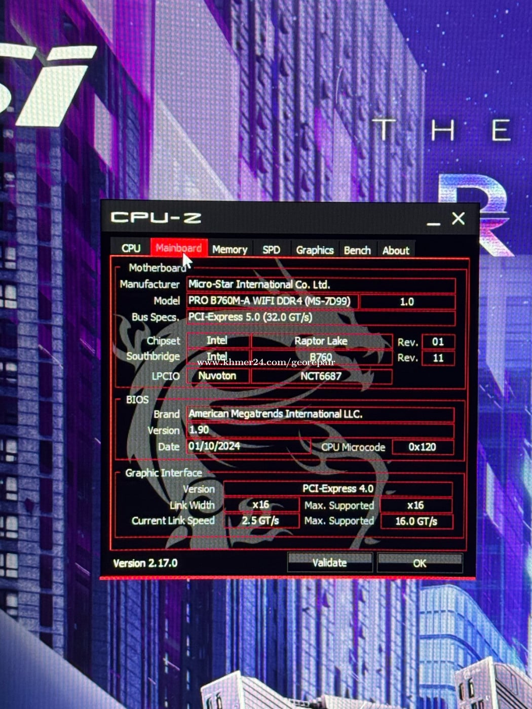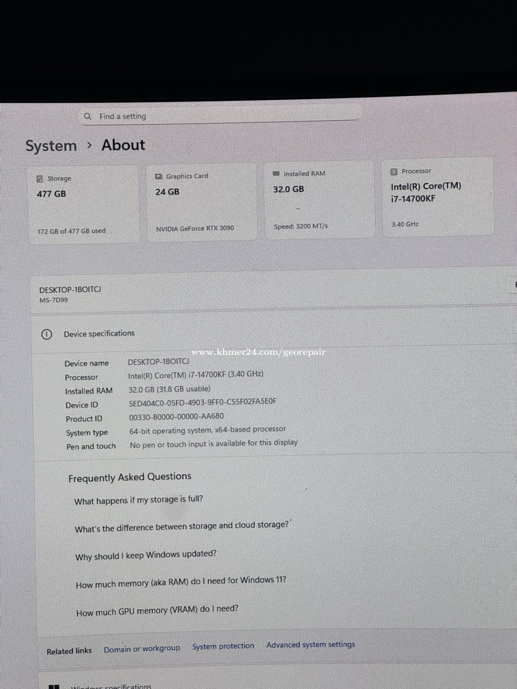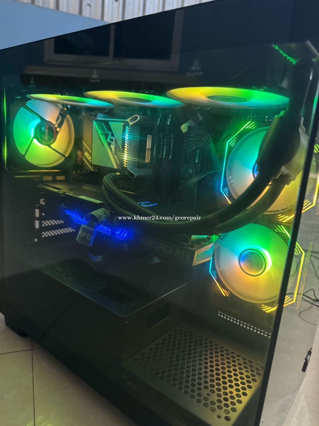 Model :Msi PRO B760m-A WiFi ddr4 CPU COREI7 ជំនាន់១៤ ល្បឿន 3.4Ghz (28 core) M.2 512g Ram : g skills DDR4 ២ ដើម ១ ដើម = 16G 2ដើម 32g Ram មាន 4 slots VGA : Nvdia GEFORCE RTX 3090 24G Power supply: Msi Mag A750BN PCie5 កម្លាំង 750w Cooling segotep fan3