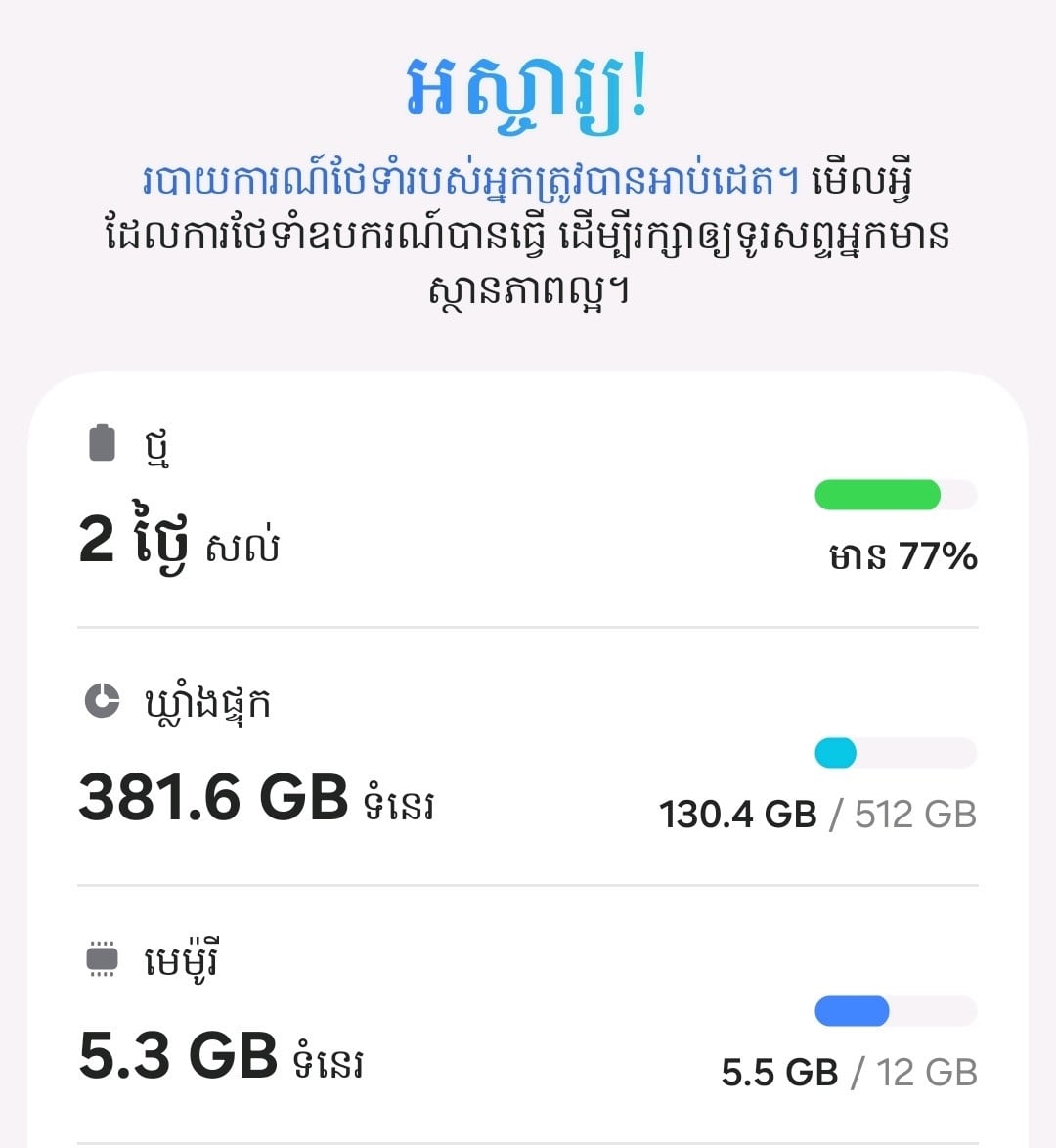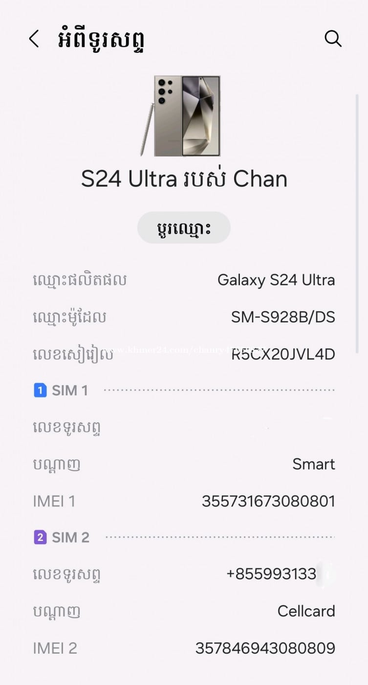 ទូរស័ព្ទខ្ញុំប្រើផ្ទាល់នៅល្អទាំងអស់អត់មានបញ្ហាអ្វីទេ ថ្មកាន់ណាស់ប្រើថែនៅស្អាត99%បើនិយាយតាមត្រង់ទៅគឺចង់ដូរច្រើនជាង បើបងៗណាមានS25Ultraក្រុមហ៊ុនចង់ដូរខ្ញុំថែមលុយឲ សុំទូរស័ព្ទល្អដែរអត់មានបញ្ហាបានហើយ128gក៏បាន