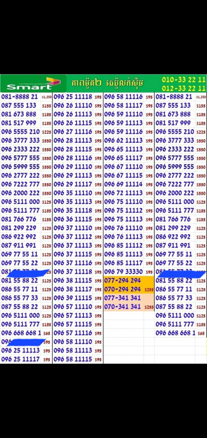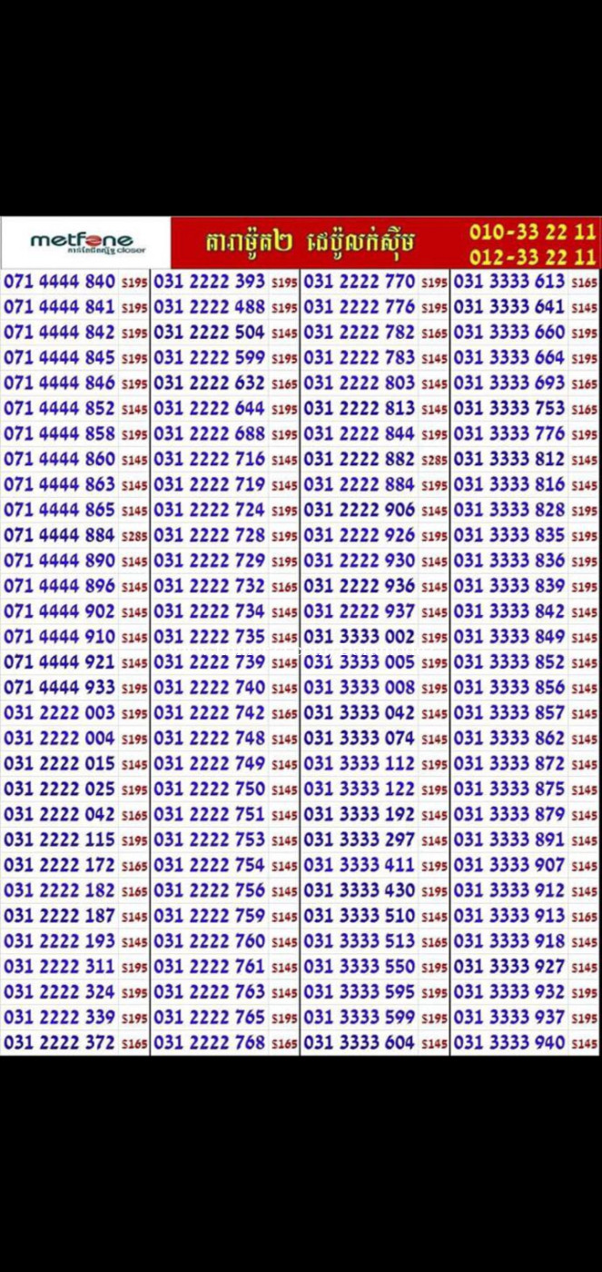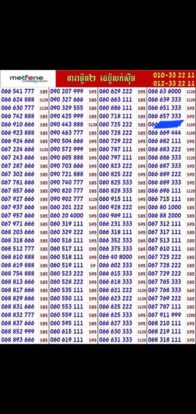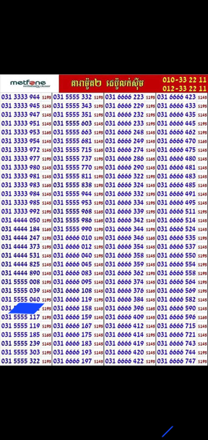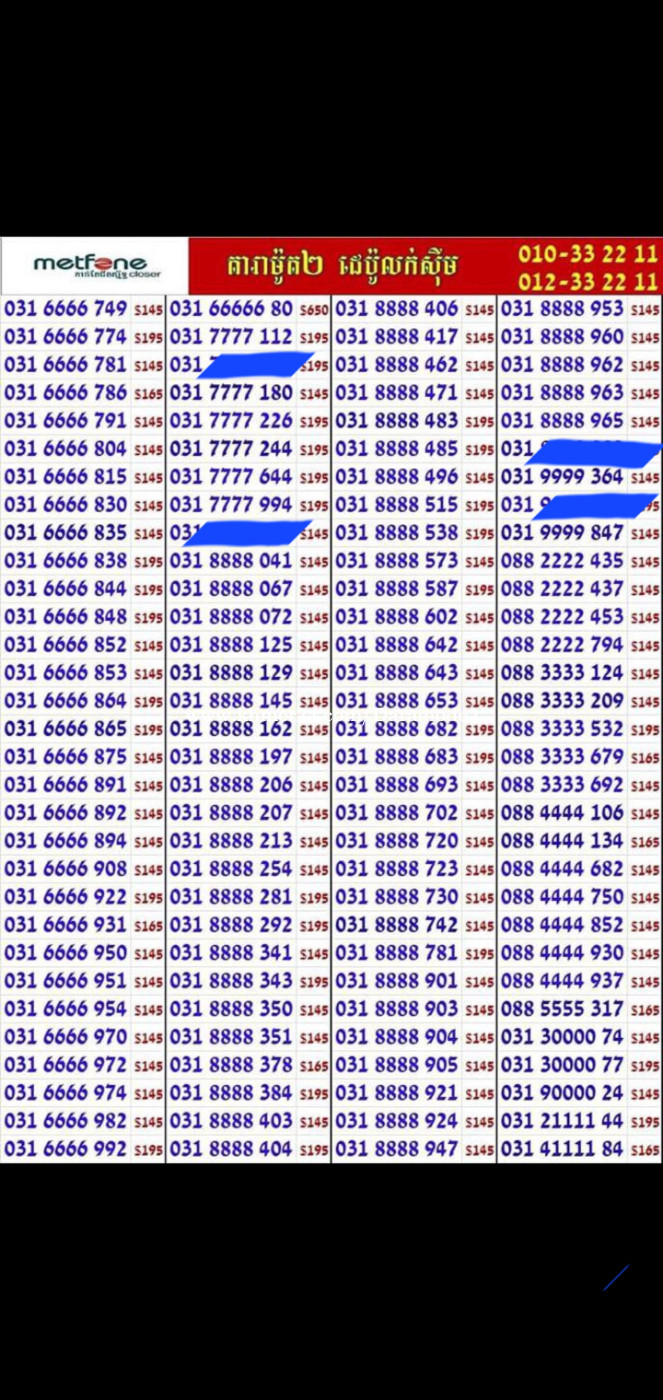 មានលក់លេខការ៉េ គ្រប់ប្រព័ន្ធ Tel: 010 33 22 11 / 012 33 22 11 Telegame: t.me/daramode2