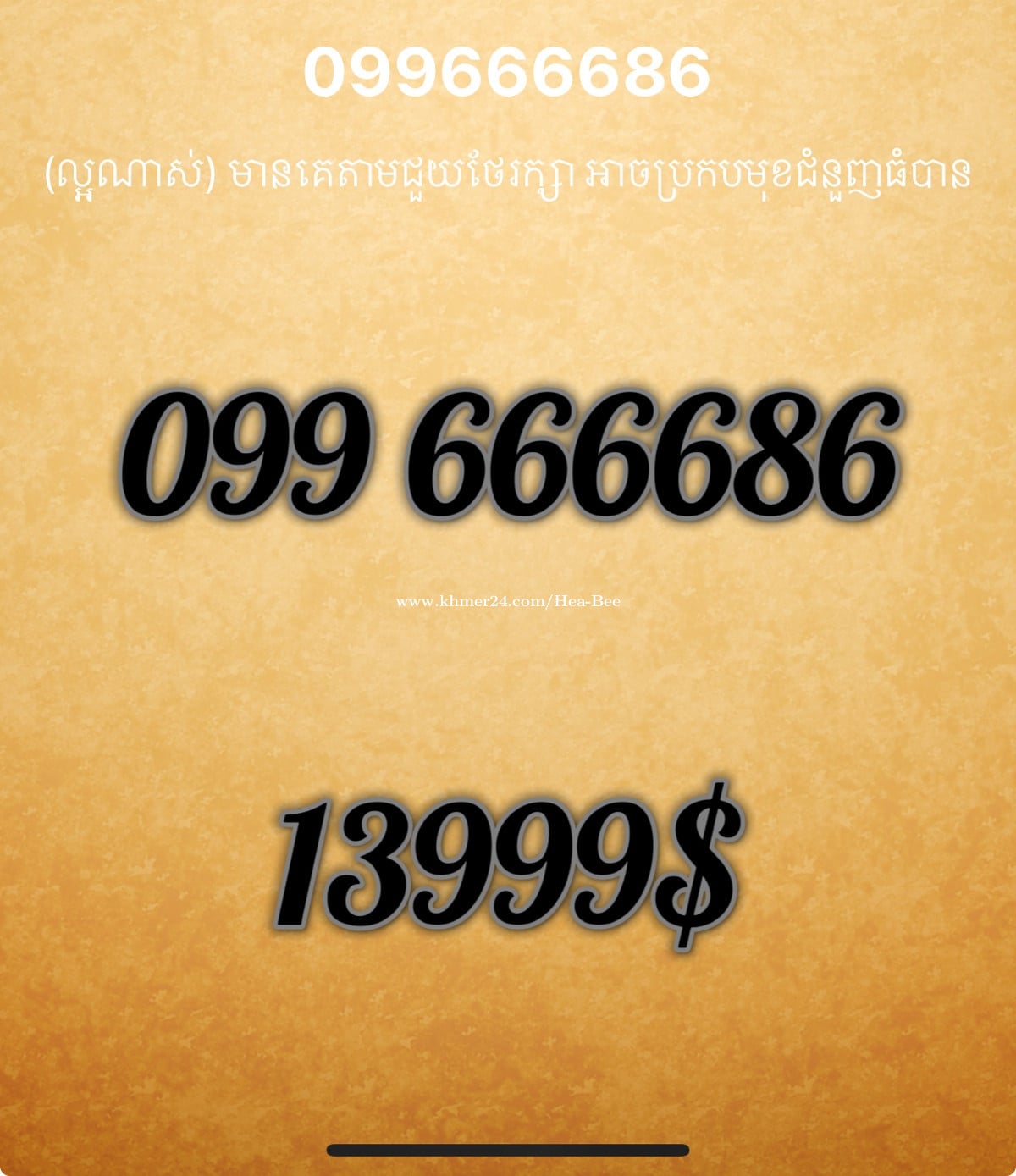 លេខហុងស៊ុយ សំរាប់អ្នកប្រកបជំនួញធំៗ ចង់លក់លេខវិញ 099 666686 តំលៃ 13999$ ចាប់អារម្មណ៍អាចទំនាក់ទំនងតាមលេខទូរស័ព្ទ 016 666 560. 017 666 560