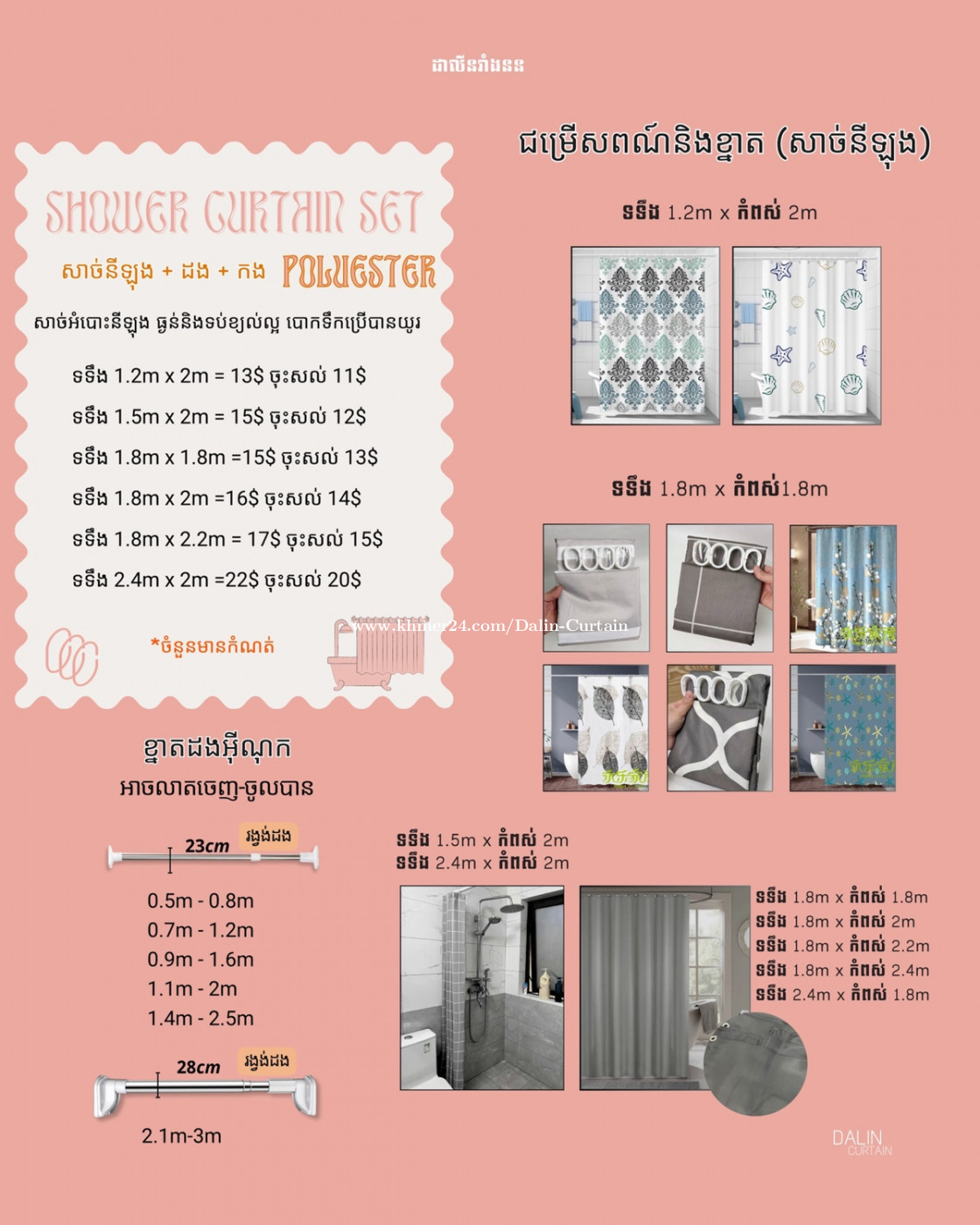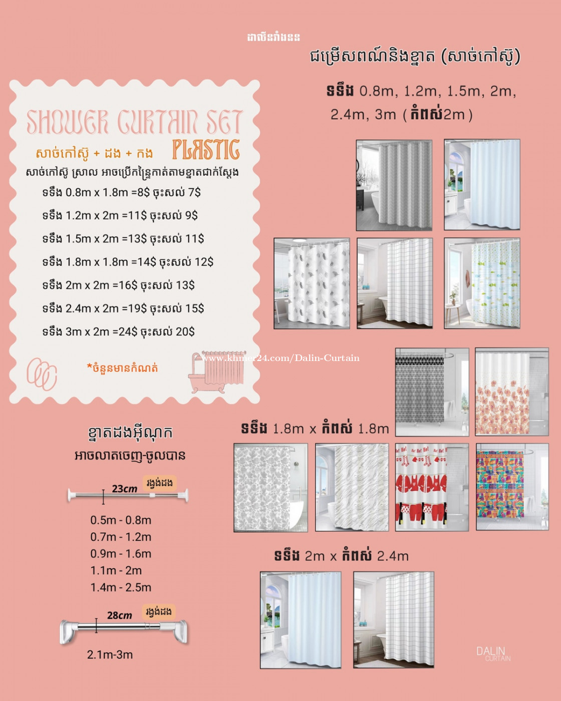 តម្លៃចាប់ពី7$ឡើងទៅ ក្នុង1ឈុត ខ្នាត 0.8m ដល់ទទឹង3m តម្លៃសមរម្យ អាចដូរពណ៍ញឹកញាប់ និងធូរថ្លៃ Telegram: https://t.me/DalinCurtain 070466xxxClick To Call | 070347xxxClick To Call | 089340xxxClick To Call