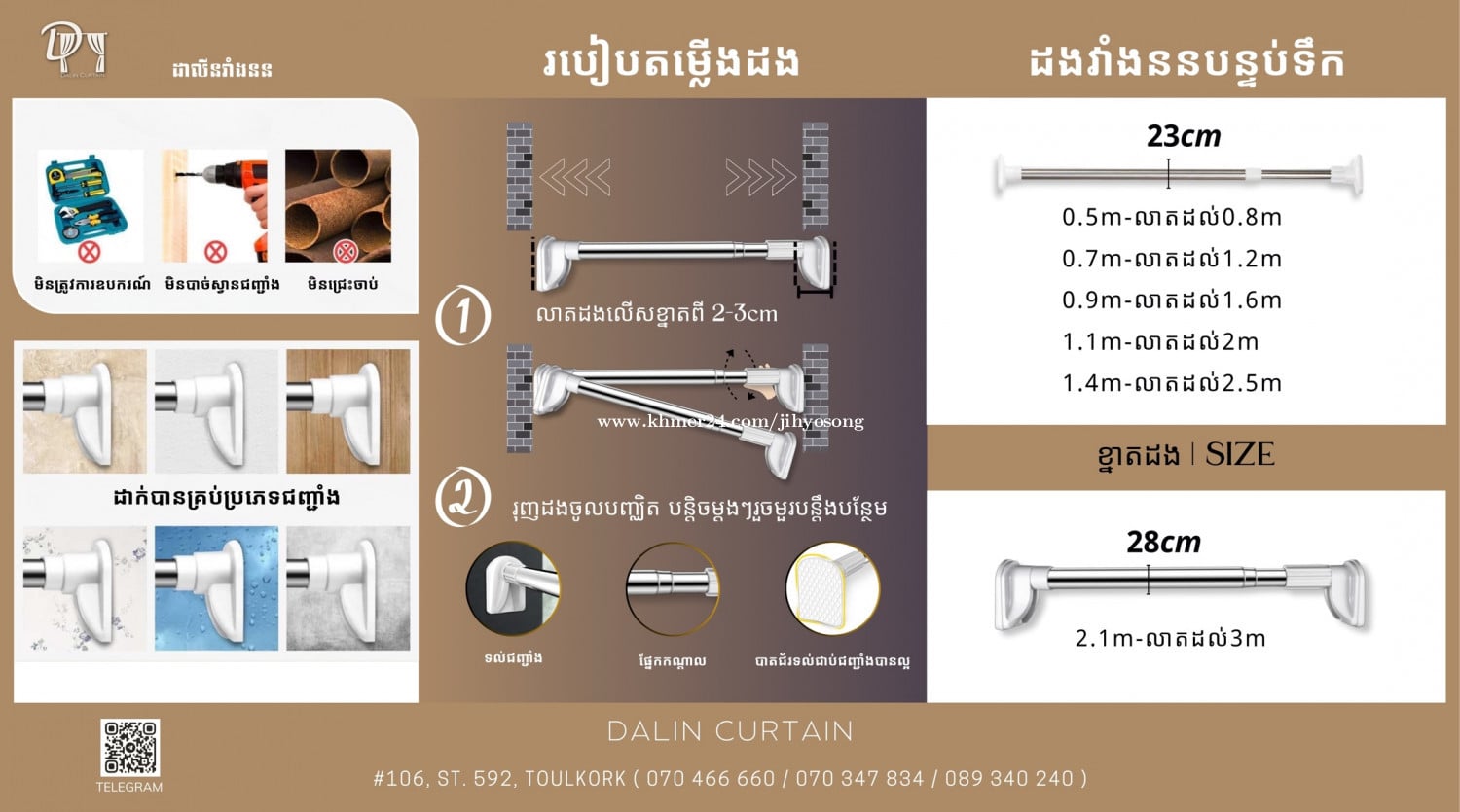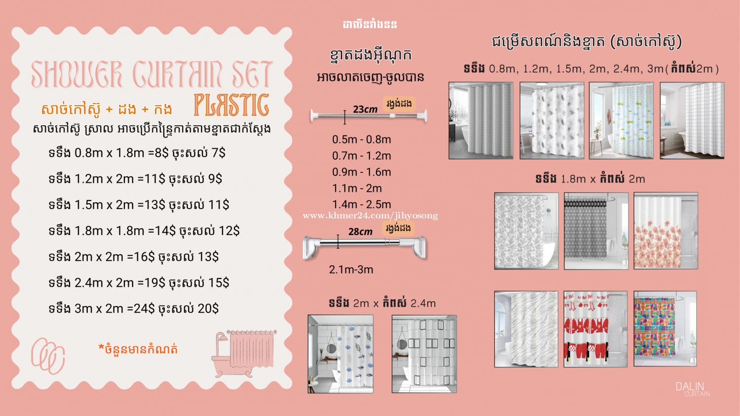 វាំងននបន្ទប់ទឹកយើងមាន2ប្រភេទ ៖ -សាច់កៅស៊ូ (ស្រាល អាចកាត់តាមខ្នាតចង់បានដោយមិនចាំបាច់ដេរ) -សាច់នីឡុង (ធ្ងន់ជាង អាចបោកទឹកបាន និងប្រើបានយូរ) យើងលក់ជាឈុត (វាំងននបន្ទប់ទឹក+ដង+កង) និងរាយក៏លក់ដែរ Telegram: 070466xxxClick To Call