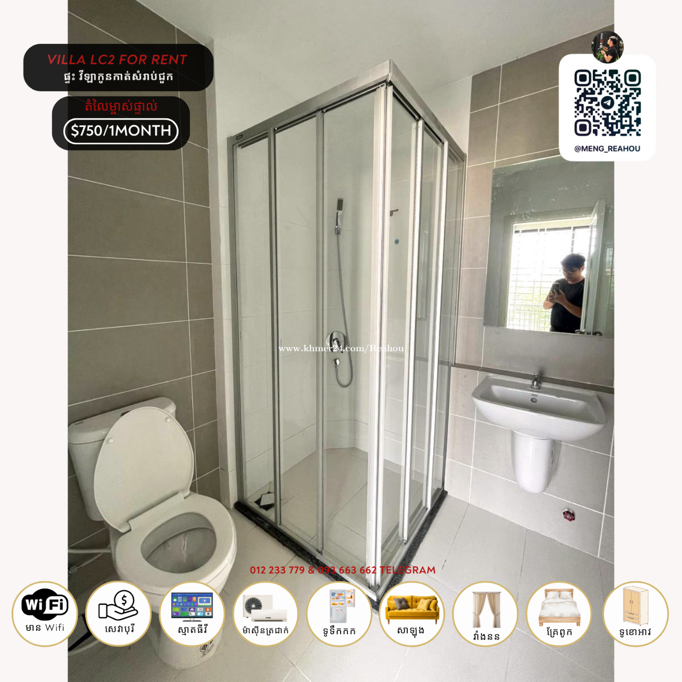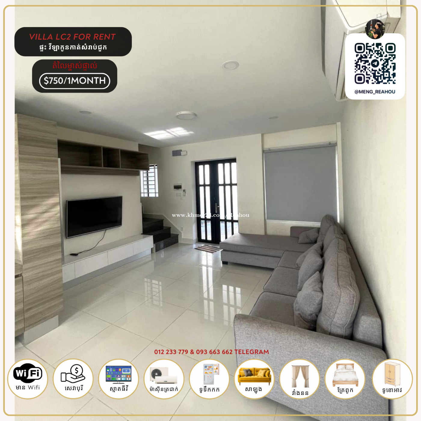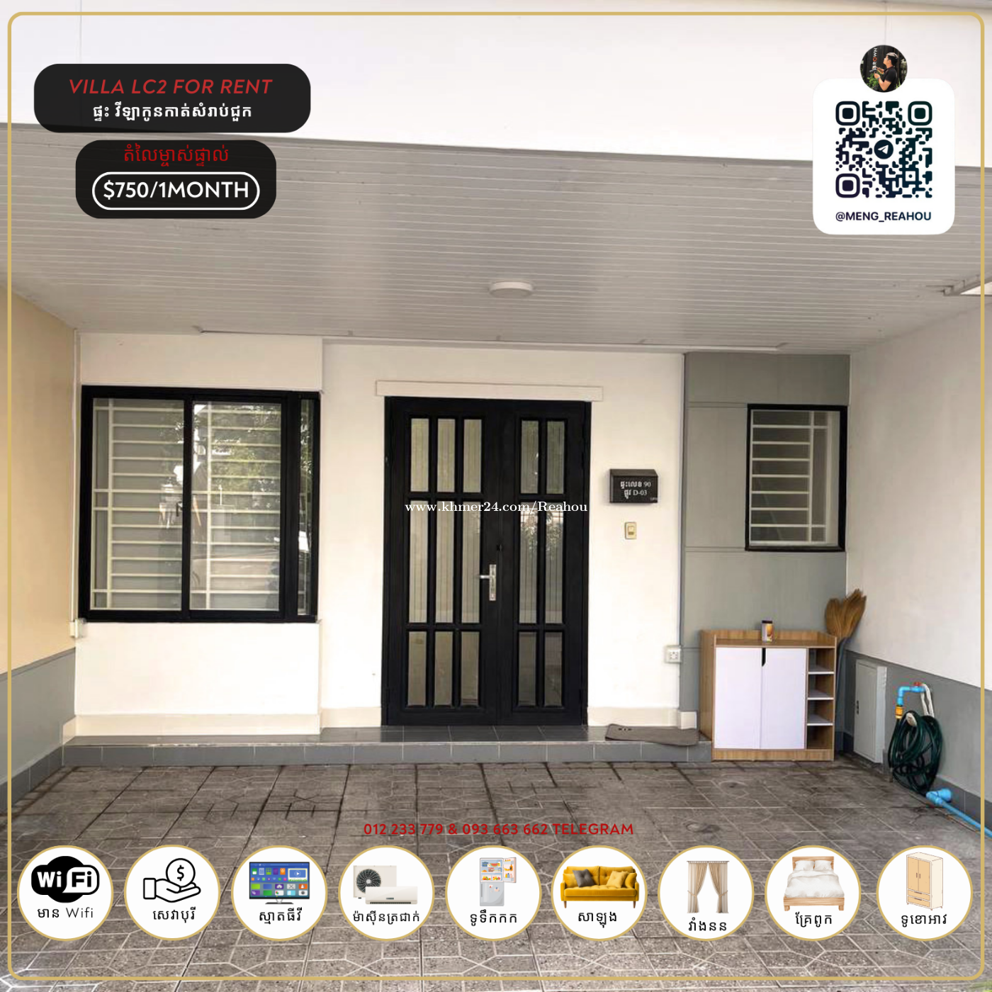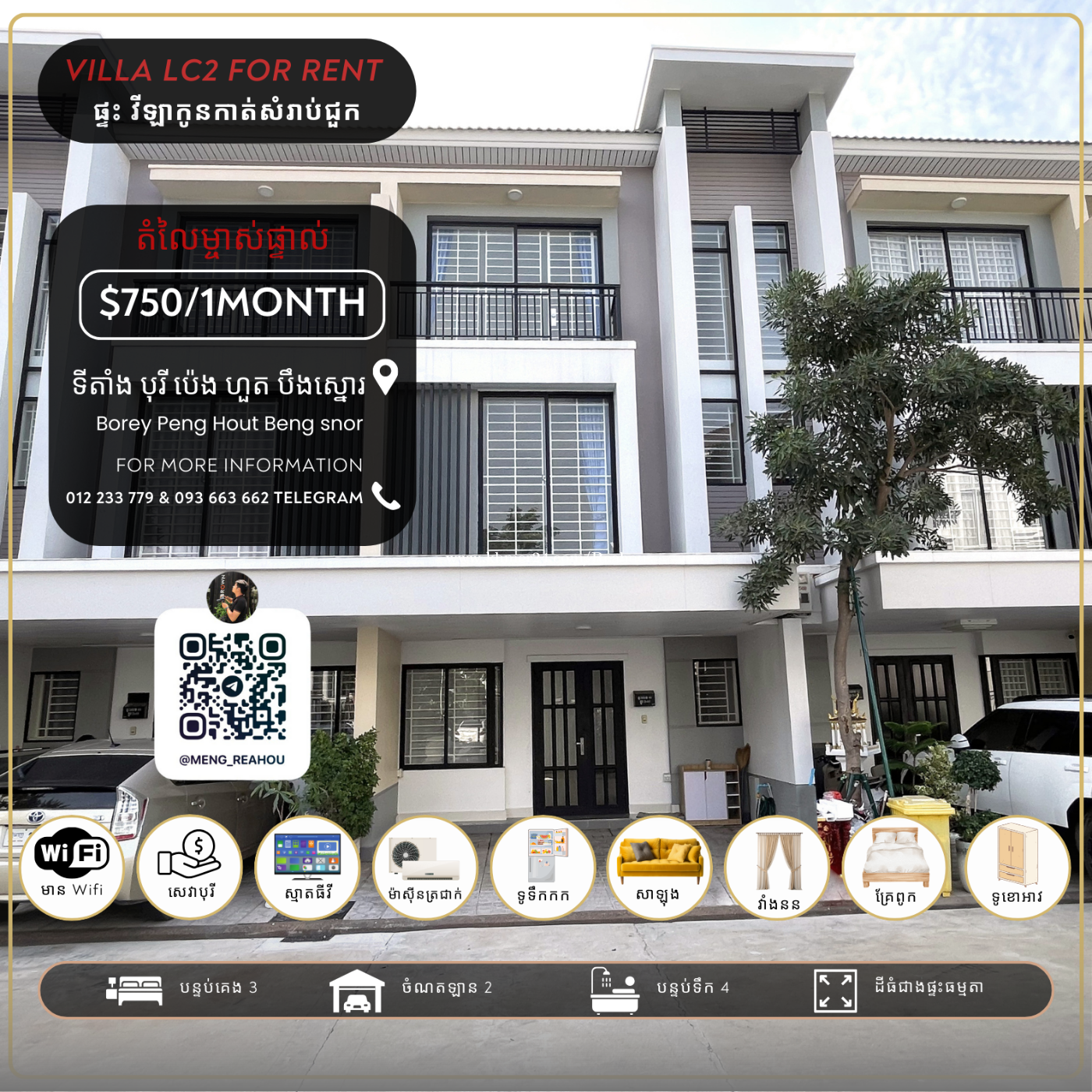 * វីឡាកូនកាត់សម្រាប់ជួល | Villa LC2 for Rent * តម្លៃជួល | Price Rent : $750 (ចរចា) * ទំហំផ្ទះ | House Size : 5.3m x 7.2m * ទំហំដី | Land Size : 5.3m x 12.5m * បន្ទប់គេង | Bedroom : 3 បន្ទប់មេគ្រួសារទំហំ 37m2 * បន្ទប់ទឹក | Bathroom : 4 * ផ្ទះបាយ | Kitchen : 1 * ដីខាងក្រោយសល់ | Back 4m * ដីខាងមុខសល់ | Front 5.5m * ផ្ទះបែរទៅត្បូង | Facing to South * ឃ្លាំងដាក់សំភារះ ធំទូលាយ | Big Warehouse * មាន Wifi ស្រាប់ | Free Wifi * Free សេវាគ្រប់គ្រងបុរី | Free Borey Management Fee *សំភារះបន្ថែមជូន: ទូរទឹកក, ម៉ាស៊ីនត្រជាក់តាមបន្ទប់, ទូរទស្សន៏ ស្មាតធីវី, សាឡុង, គ្រែងគេងពូក, ទូរសំលៀកបំពាក់, ទូសំអាង, ទូរស្បែកជើង, តុសំអាង និង វាំងនន។ *Additional furnishings included: Refrigerator, Air conditioner in each room, Smart TV, Sofa, Bed with mattress, Wardrobe / Closet, Dressing table, Shoe cabinet, vanity table, Curtains. ☆ ទីតាំង ក្នុងបុរីប៉េងហួត បឹងស្នោរ សង្កាត់និរោធ ខណ្ឌច្បារអំពៅ គម្រោង អេកូឌែលតា | Location in Borey Peng Huoth Beung Snor Project Eco Delta.