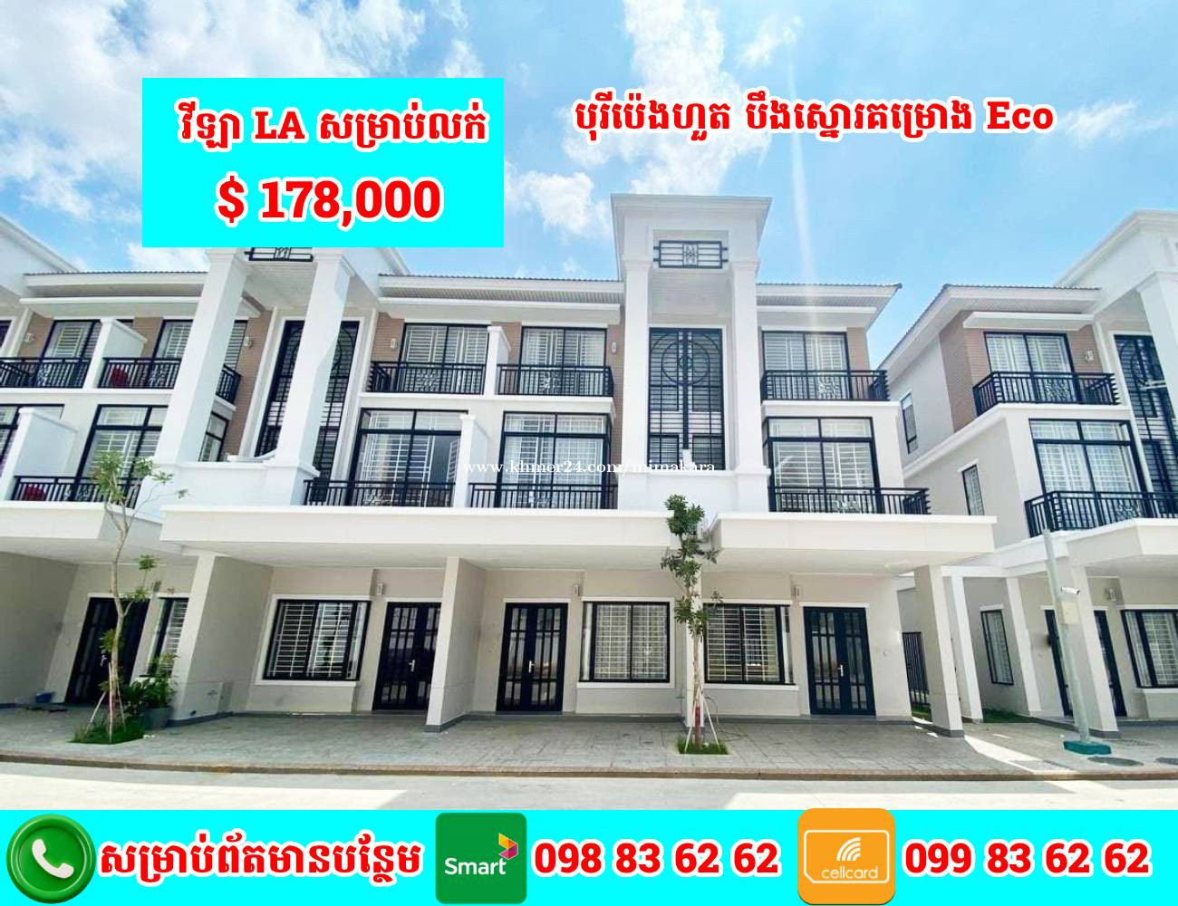 វីឡាកូនកាត់ LA សម្រាប់លក់ បុរីប៉េងហួត បឹងស្នោរ គម្រោង Eco dailta តម្លៃលក់ 178,000$ ចរចាបាន ផ្ទេរកម្មសិទ្ធិត្រឹមបុរី ទំហំដី 5.2m x 19m ទំហំផ្ទះ 5.2m x 12m បន្ទប់គេង 4 និង បន្ទប់ទឹក 05 ផ្ទះបែរទិសត្បូង ព័ត៌មានបន្ថែម 099836xxxClick To Call Telegram