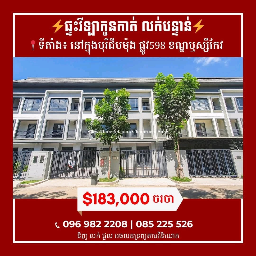 ផ្ទះវីឡាកូនកាត់LAសម្រាលក់!! 📍ទីតាំង ៖ នៅបុរីជីបម៉ុង598 សង្កាត់ច្រាំងចំរេះ𝟐 ខណ្ឌឫស្សីកែវ រាជធានីភ្នំពេញ - តម្លៃលក់: $𝟏𝟖𝟑,𝟎𝟎𝟎 (កាត់ប្លង់រឹងជូន) - ទំហំដី : 𝟓𝐦 𝐱 𝟐𝟑𝐦 - ទំហំផ្ទះ : 𝟓𝐦 𝐱 𝟏𝟑.𝟕𝐦 - បន្ទប់គេង 𝟒 , បន្ទប់ទឹក 𝟓 - ផ្ទះបាយ 𝟏 , កន្លែងទទួលភ្ញៀវ 𝟏 - កាត់ប្លង់រឹងជូន - លេខអាជ្ញាប័ណ្ណ : 𝐄-𝟐𝟐-𝟒𝟎𝟒 📲សម្រាប់ព័ត៌មានលម្អិត ៖ 𝟎𝟗𝟔𝟗𝟖𝟐𝟐𝟐𝟎𝟖 | 𝟎𝟖𝟓𝟐𝟐𝟓𝟓𝟐𝟔 Telegram: https://t.me/Chamroeun_Song ⭐️ 𝐉𝐨𝐢𝐧 𝐓𝐞𝐥𝐞𝐠𝐫𝐚𝐦 𝐂𝐡𝐚𝐧𝐧𝐞𝐥 https://t.me/chamroeun_viniyuk សូមអរគុណ!! ---------------------------------------- #ផ្ទះវីឡាលក់ #បុរីជីបម៉ុង598 #ខណ្ឌឬស្សីកែវ #វិនិយោគ