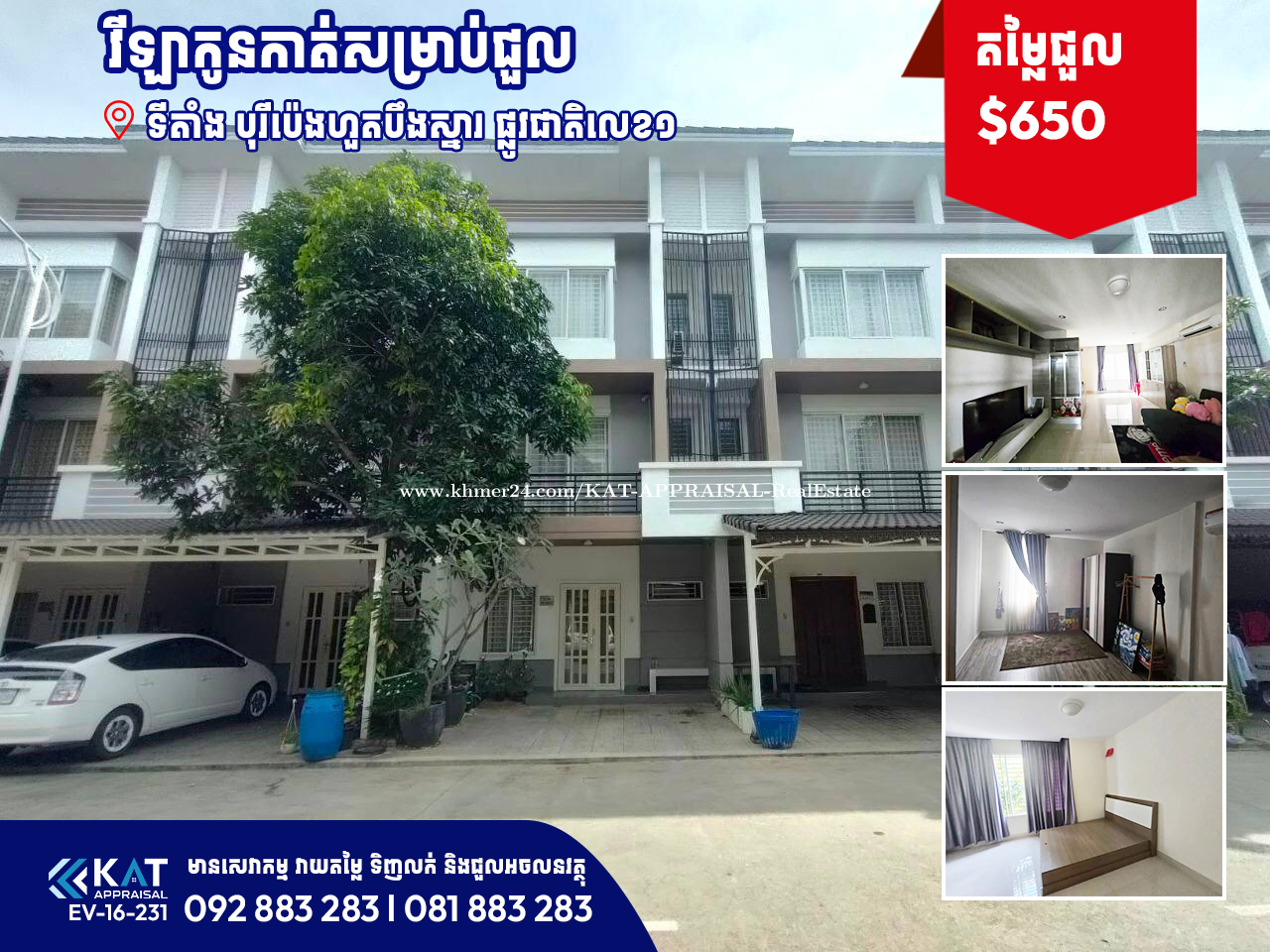 វីឡាកូនកាត់LC2 សម្រាប់ជួល | Link house LC2 For Rent -តម្លៃជួល | Rent Price: $650 -ទំហំដី | Land Size: 5.3m x 14.7m -ទំហំផ្ទះ | House Size: 5.3mx7.2m -បន្ទប់គេង | Bedroom: 3 -បន្ទប់ទឹក | Bathroom: 4 -បែរទិសជើង | North -មានសំភារះ គ្រែពូ សាឡុង ម៉ាសុីនត្រជាក់ វាំងនន - ទីតាំង/ Location: បុរីប៉េងហួត បឹងស្នោរ សង្កាត់និរោធ ខណ្ឌច្បារអំពៅ រាជធានីភ្នំពេញ។ Tel: 092883xxxClick To Call l 081883xxxClick To Call Telegram Chat : https://t.me/katappraisalsupport Telegram Channel : https://t.me/KAT_APPRAISAL