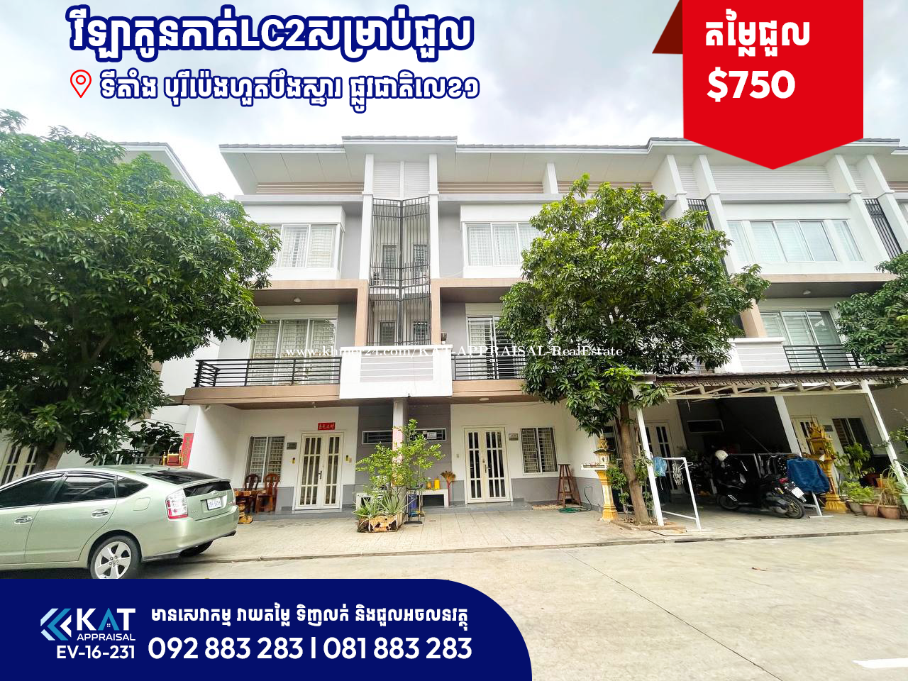 វីឡាកូនកាត់LC2 សម្រាប់ជួល Link house LC2 For Rent -តម្លៃជួល| Rent Price: $750 -ទំហំដី | Land Size: 6.3m x 14.7m - ទំហំផ្ទះ | House Size: 5.3mx7.2m -បន្ទប់គេង | Bedroom: 3 -បន្ទប់ទឹក | Bathroom: 4 - ទីតាំង/ Location: បុរីប៉េងហួតបឹងស្នោរ, សង្កាត់និរោធ, ខណ្ឌច្បារអំពៅ, រាជធានីភ្នំពេញ។ Tel: 092883xxxClick To Call l 081883xxxClick To Call Telegram Chat : https://t.me/katappraisalsupport Telegram Channel : https://t.me/KAT_APPRAISAL