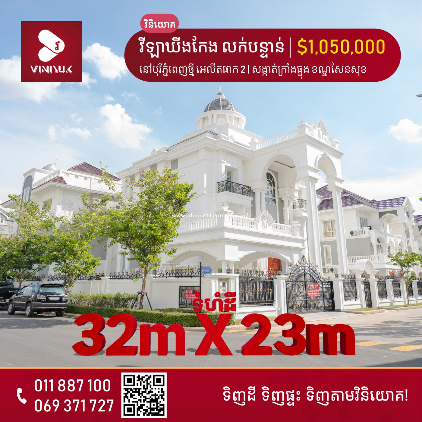 🏡វីឡាឃីងកែង លក់បន្ទាន់ (#បញចុះតម្លៃពិសេស)!! 📍ទីតាំង ៖ នៅបុរីភ្នំពេញថ្មី អេលីតផាក 2 | សង្កាត់ក្រាំងធ្នុង ខណ្ឌសែនសុខ - តម្លៃ ៖ $1,050,000 (ចរចា) - ទំហំដី ៖ 32m x 23m - ទំហំផ្ទះ ៖ 15m x 13m - បន្ទប់គេង 7 , បន្ទប់ទឹក 9 - កន្លែងទទួលភ្ញៀវធំទូលាយ - ផ្ទះថ្មីមិនទាន់ចូលរស់នៅ - សំណង់មានគុណភាពល្អ - ទិសបែរខាងជើង - កាត់ប្លង់រឹងជូន - លេខអាជ្ញាប័ណ្ណ : E-22-404