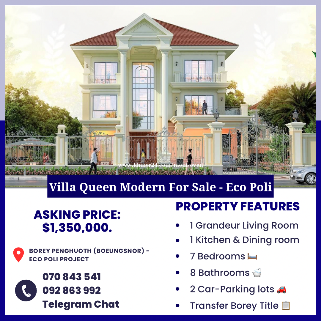វីឡាឃ្វីន ម៉ូដថ្មី លក់បន្ទាន់ | Villa Queen (Modern) for Sale (urgent) | Borey Penghuoth 🏠 📍ទីតាំង: បុរីប៉េងហួតបឹងស្នោរ, គម្រោងអេកូប៉ូលី 1 / Borey Penghuoth Boeung Snor, Eco Poli project 💰 តម្លៃលក់ / Sale Price : $ 1,350,000. + នៅមុខសួនធំ ក្នុងគម្រោង / in front of Park + ទំហំដី / Land size : 21m x 31m + បន្ទប់គេង / Bedroom : 7 + បន្ទប់ទឹក / Bathroom : 9 + បន្ទប់ទទួលភ្ញៀវ / Living room : 1 + ផ្ទះបាយ / Kitchen : 1 + ចំណតឡាន / Parking: 2 📲ទំនាក់ទំនង/Telegram: Hotline: 070843xxxClick To Call / 092863xxxClick To Call Direct Chat: https://t.me/samnang_TSN #QueenVillaModern #HouseForSale #YourDreamHome #EcoPoli #BoreyPenghuothBoeungsnor #PremiumCommunity #ChbarAmpov #PhnomPenh