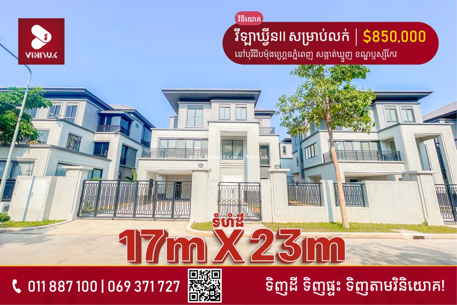 🏡វីឡាឃ្វីនII សម្រាប់លក់ !! 📍ទីតាំង ៖នៅបុរីជីបម៉ុងហ្រ្គេនភ្នំពេញ សង្កាត់ឃ្មួញ ខណ្ឌឫស្សីកែវ រាជធានីភ្នំពេញ - តម្លៃលក់ : $850,000 ចរចា - ទំហំដី : 17m x 23m - ទំហំផ្ទះ : 13m x 12.5m - បន្ទប់គេង 6បន្ទប់ទឹក 7 - ផ្ទះបាយ 1 , កន្លែងទទួលភ្ញៀវ 1 - ប្លង់ បុរី - ទិសខាងកើត - លេខអាជ្ញាប័ណ្ណ : E-22-404