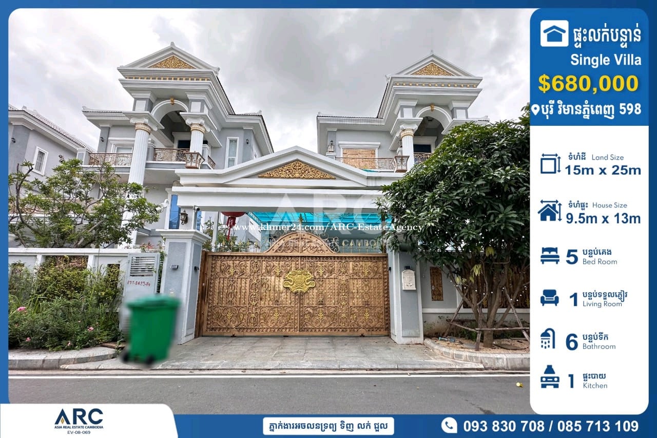 #Single Villa For Sale at Borey Vimean Phnom Penh 598 #វីឡាទោលដាក់លក់បន្ទាន់នៅក្នុងបុរី វិមានភ្នំពេញ 598 ជិតផ្សារទំនេីបអុីអន២ 🔹 តម្លៃលក់ : $680,000 (ចរចាម្ចាស់ផ្ទាល់) 🔹 កាត់ឈ្មោះប្លង់រឹងជូន 🔹 ទំហំដី : 15m x 25m 🔹 ទំហំផ្ទះ : 9.5m x 13m 🔹 បន្ទប់គេង : 05 បន្ទប់ទឹក : 06 📍ទីតាំងត្រឹមតែ05នាទីពីផ្សារទំនើប AEON2 Makro សង្កាត់ច្រាំងចំរេះទី២ ,ខណ្ឌឬស្សីកែវ ,រាជធានីភ្នំពេញ សម្រាប់ពត៏មានលម្អិតសូមទំនាក់ទំនងមកក្រុមការងារ 085713xxxClick To Call / 093830xxxClick To Call / 0978899xxxClick To Call Chat to Telegram Agent https://t.me/sonsela14 Channel Telegram https://t.me/ARCKhanResseykeo 👉 អាជ្ញាប័ណ្ណ៖ EV-08-069