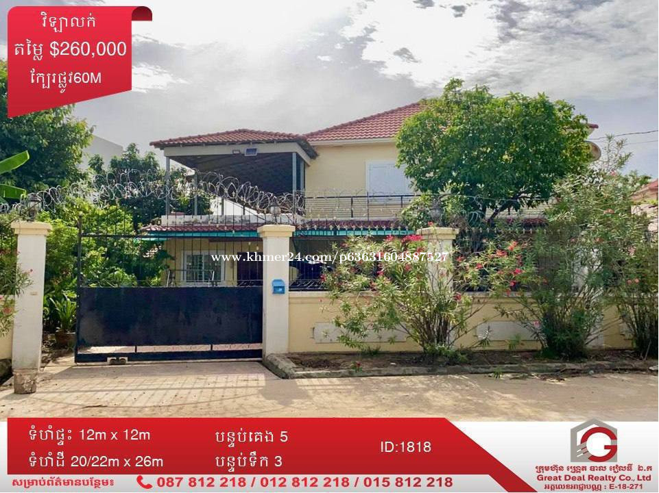 📣📣 ផ្ទះវីឡាសម្រាប់លក់ /Villa For Sale 📍ទីតាំង /Location: ព្រែកហូរ-60ម ជិតព្រលានថ្មី /Prekho – near new Airport 💲តម្លៃលក់ /Selling Price: 260,000$ (ចរចា/Nego) ▶️ទំហំផ្ទះ /House Size: 12m x 12m ▶️ទំហំដី /Land Size: 20/22m x 26m ▶️បន្ទប់គេង /Bedroom: 5 បន្ទប់ទឹក / Bathroom: 3 ▶️ប្លង់រឹង /Hard title: 468m2 ☎️សម្រាប់ព័ត៌មានបន្ថែម៖ 012812xxxClick To Call/ 015812xxxClick To Call/ 087812xxxClick To Call PropertyID1818