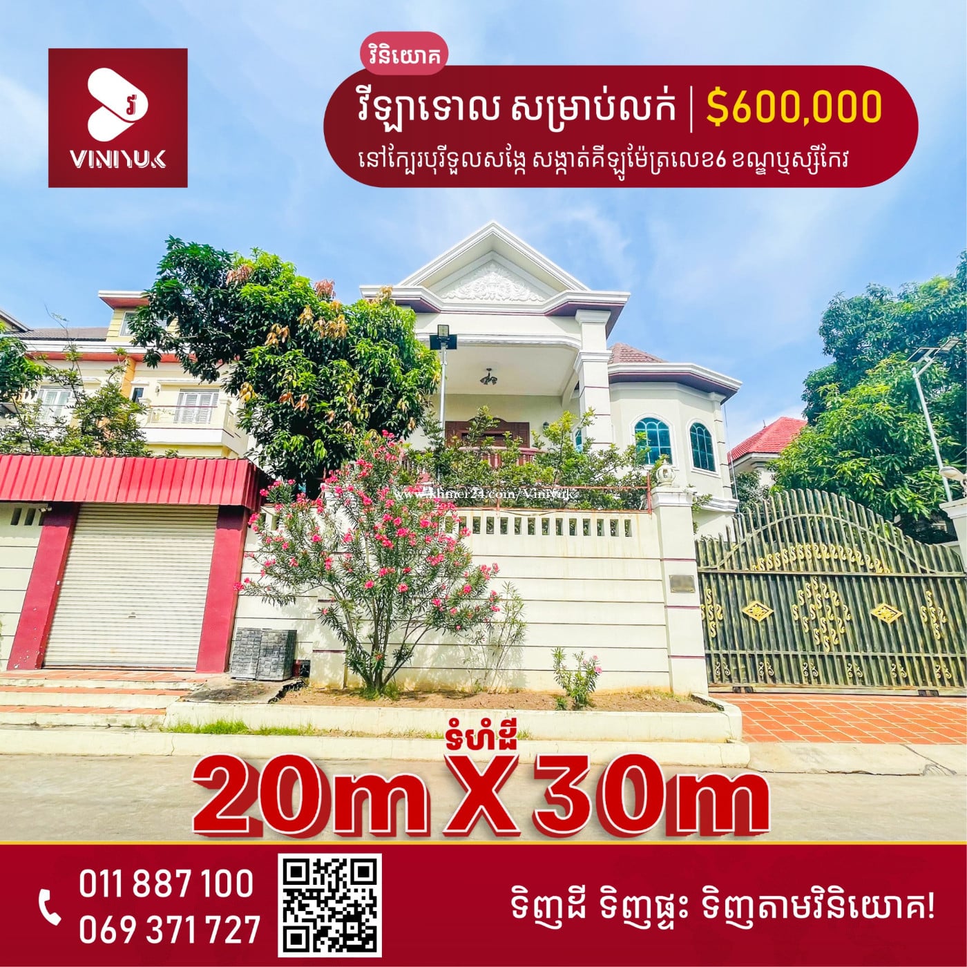 🏡វីឡាទោល សម្រាប់លក់ !! 📍ទីតាំង ៖ នៅក្បែរបុរីទួលសង្កែ សង្កាត់គីឡូម៉ែត្រលេខ6 ខណ្ឌឬស្សីកែវ រាជធានីភ្នំពេញ - តម្លៃ ៖ $595000 (ចរចាបាន) - ទំហំផ្ទះ ៖ 16m x 18m - ទំហំដី ៖ 20m x 30m - បន្ទប់គេង 7, បន្ទប់ទឹក8 - កាត់ប្លង់រឹងជូន - ផ្ទះថ្មីស្អាត - លេខអាជ្ញាប័ណ្ណ : E-22-404 📲សូមធ្វើការទំនាក់ទំនង ៖ 011887xxxClick To Call | 010887xxxClick To Call 011371xxxClick To Call | 069371xxxClick To Call