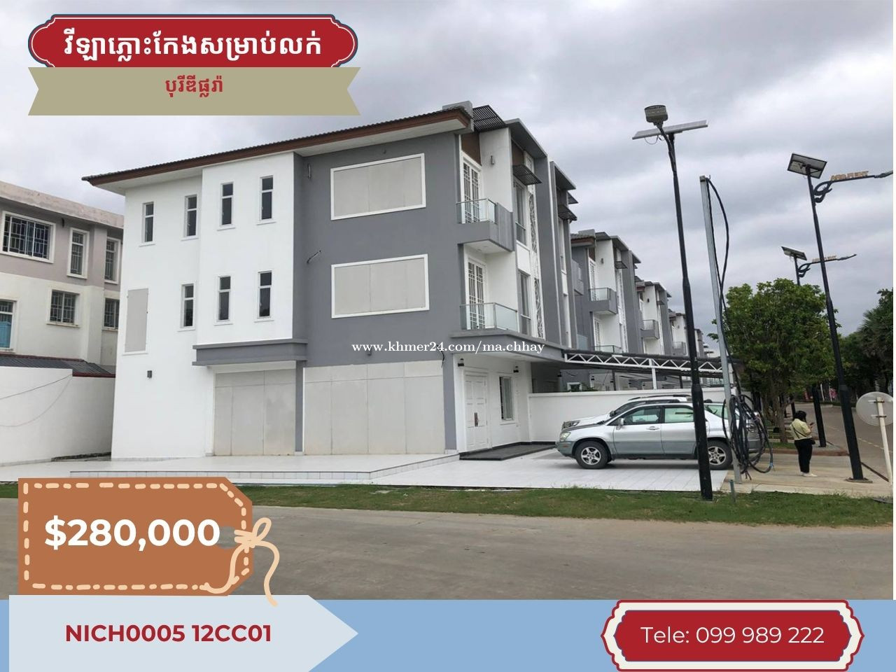 NICH0005 12CC01 វីឡាភ្លោះកែងមុខផ្សារសម្រាប់លក់នៅបុរីឌីផ្លរ៉ា > ទ្រព្យមានទីតាំងល្អងាយស្រួលក្នុងការប្រកបអាជីវកម្ម... * ទីតាំង៖ សង្កាត់បាក់ខែង, ខណ្ឌជ្រោយចង្វារ, រាជធានីភ្នំពេញ * តម្លៃលក់៖ $280,000 (ចរចា) * ទំហំដី៖ 12m x 21m * ទំហំផ្ទះ៖ 6m x 12m * បន្ទប់គេង៖ 4 * បន្ទប់ទឹក៖ 5 * ទិសដៅទ្រព្យ៖ ខាងត្បូង 📞សម្រាប់ព័ត៌មានបន្ថែម៖ 010989xxxClick To Call (Smart), 099989xxxClick To Call (Mobitel), 0889890xxxClick To Call (Metfone) *តេឡេក្រាម: 099989xxxClick To Call សូមអរគុណ! --------------------
