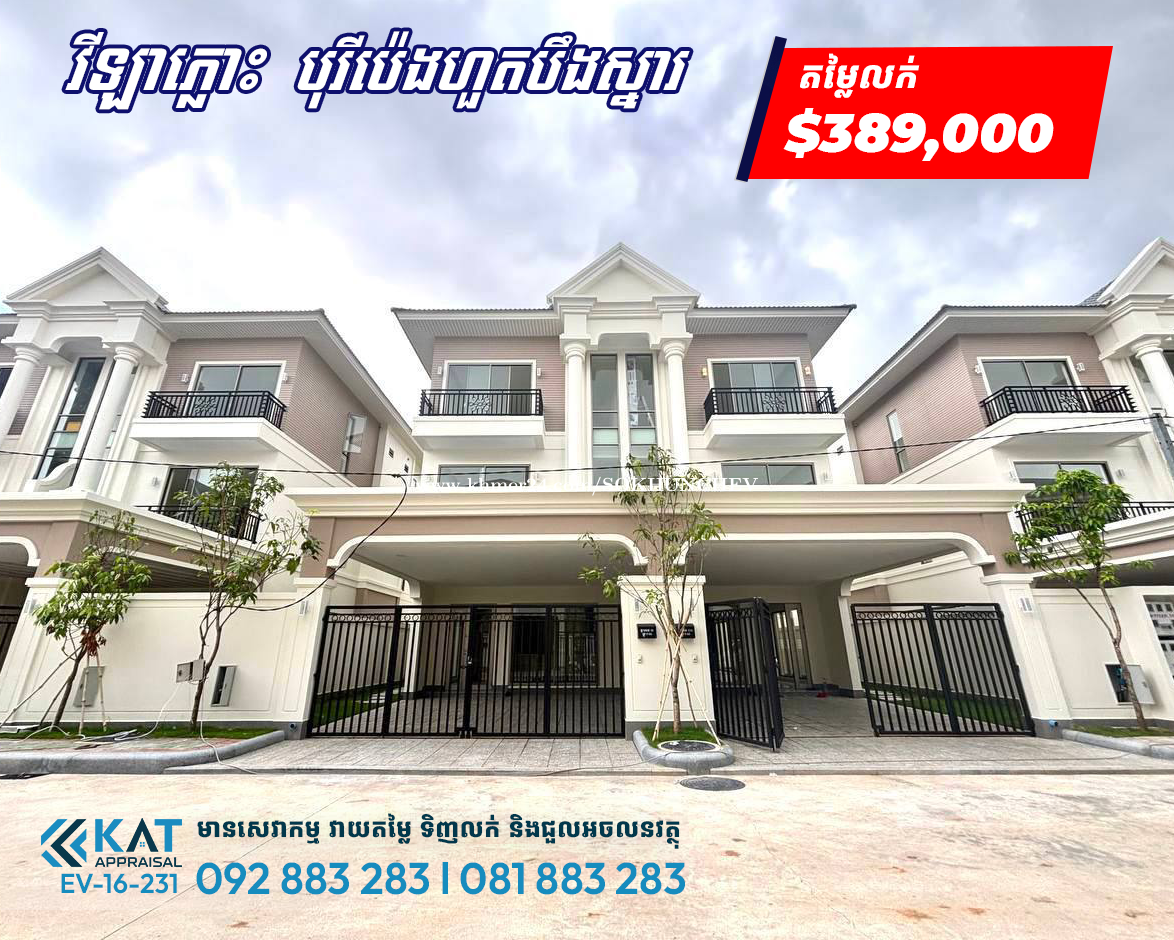 វីឡាភ្លោះប៊ី Twin B Modern ដីធំសម្រាប់លក់ , Eco poli 2(រូបគំរូ) - តម្លៃលក់ : $389,000 (ចរចា) ប្លង់ត្រឹមបុរី - ខាងក្រោយសល់4.4m ចំហៀងសល់2.6m - ទំហំដី : 8.6m x 27.5m - ទំហំផ្ទះ : 6m x 16.8m - បន្ទប់គេង: 4 | - បន្ទប់ទឹក: 5 - ទិស: កើត - ទីតាំងបុរីប៉េងហួតបឹងស្នោរ គម្រោង អេកូប៉ូលី2 Tel: 092883xxxClick To Call l 081883xxxClick To Call Telegram Chat : https://t.me/katappraisalsupport Telegram Channel : https://t.me/KAT_APPRAISAL