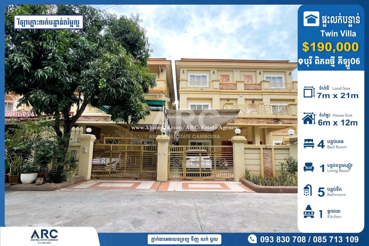 #Twin Villa For Sale at Borey Piphup Thmey Km6 #វីឡាភ្លោះលក់បន្ទាន់នៅក្នុងបុរី ពិភពថ្មី គីឡូលេខ6 ជាប់ផ្លូវជាតិលេខ5 ជិត( CTN TV ) 🔹 តម្លៃលក់ក្រោមទីផ្សារ : $190,000 ( ចរចាម្ចាស់ផ្ទាល់ ) 🔹 កាត់ឈ្មោះប្លង់រឹងជូន 🔹 ទំហំដី : 7m x 21m 🔹 ទំហំផ្ទះ : 6m x 12m 🔹 បន្ទប់គេង : 04 បន្ទប់ទឹក : 05 📍 ទីតាំងទីតាំងត្រឹមតែ08នាទីពីវត្តភ្នំ នៅសង្កាត់គីឡូលេខ៦, ខណ្ឌឬស្សីកែវ ,រាជធានីភ្នំពេញ សម្រាប់ពត៏មានលម្អិតសូមទំនាក់ទំនងមកក្រុមការងារ 085713xxxClick To Call / 093830xxxClick To Call / 0978899xxxClick To Call Chat to Telegram Agent https://t.me/sonsela14 Channel Telegram https://t.me/ARCKhanResseykeo 👉 អាជ្ញាប័ណ្ណ៖ EV-08-069